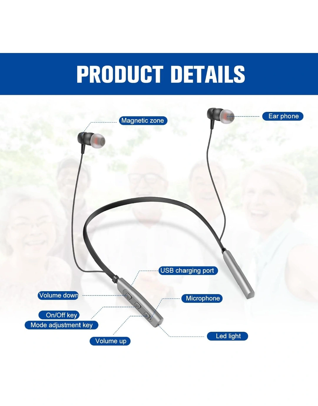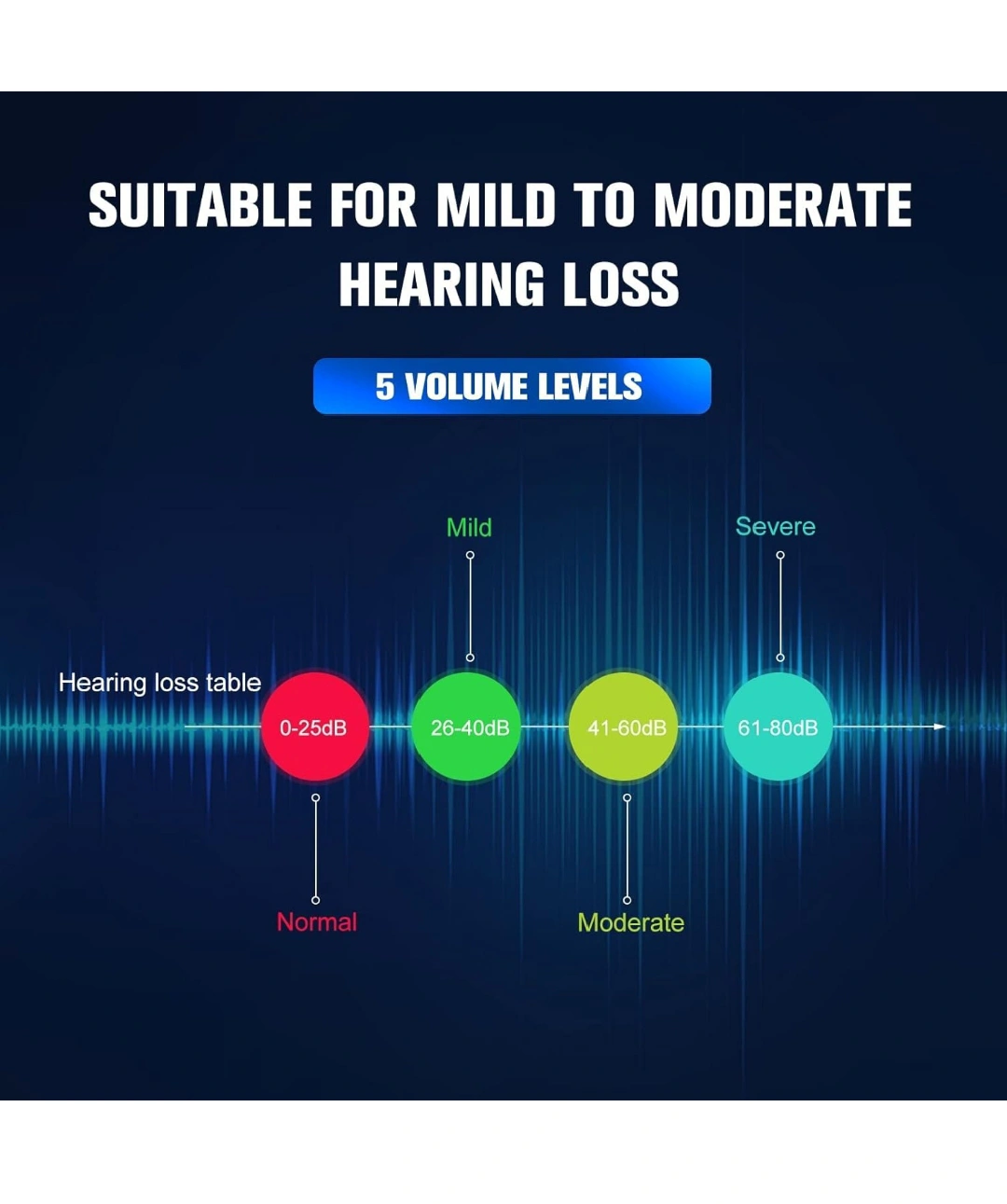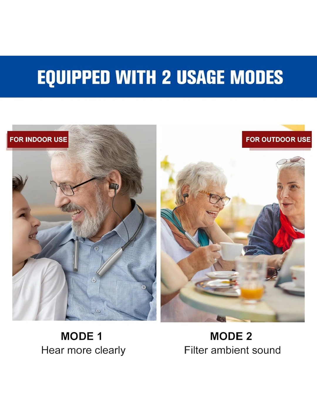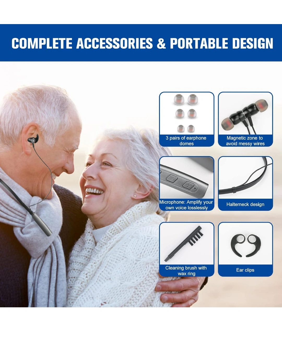 Wireless Bluetooth headphones with 5 volume levels, 2 usage modes, and up to 80 hours of usage time. Includes ear clips, cleaning brush, and extra ear domes.Rechargeable Sound Amplifier for Seniors Adults All Day Battery Life, Audio Listening Assistive Device with Noise Canceling No Whistling 2 Modes with 5 Volumes Control.