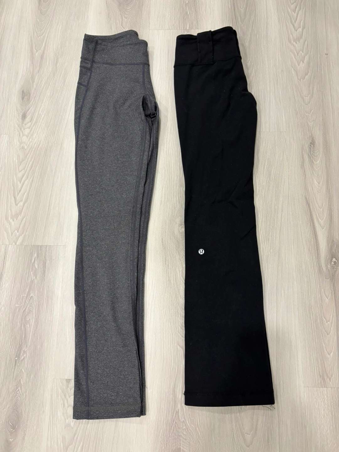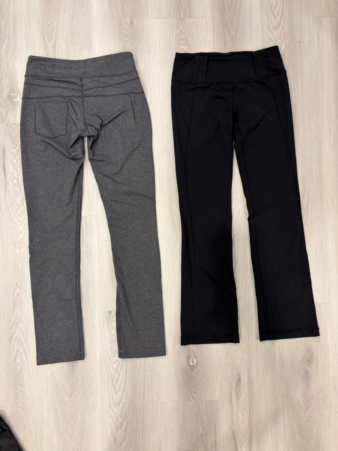 Two pairs of Lululemon pants, one grey and one black. Both in size 6. Fits more like a size 4