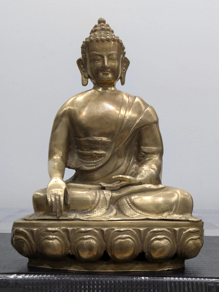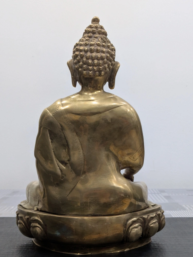 Antique Brass Buddha statue in a meditative sitting pose. Stands 14 inches tall and 10 inches wide, with an approximate weight of 9.6 pounds. Features intricate detailing, making it ideal for display or as part of a collection.