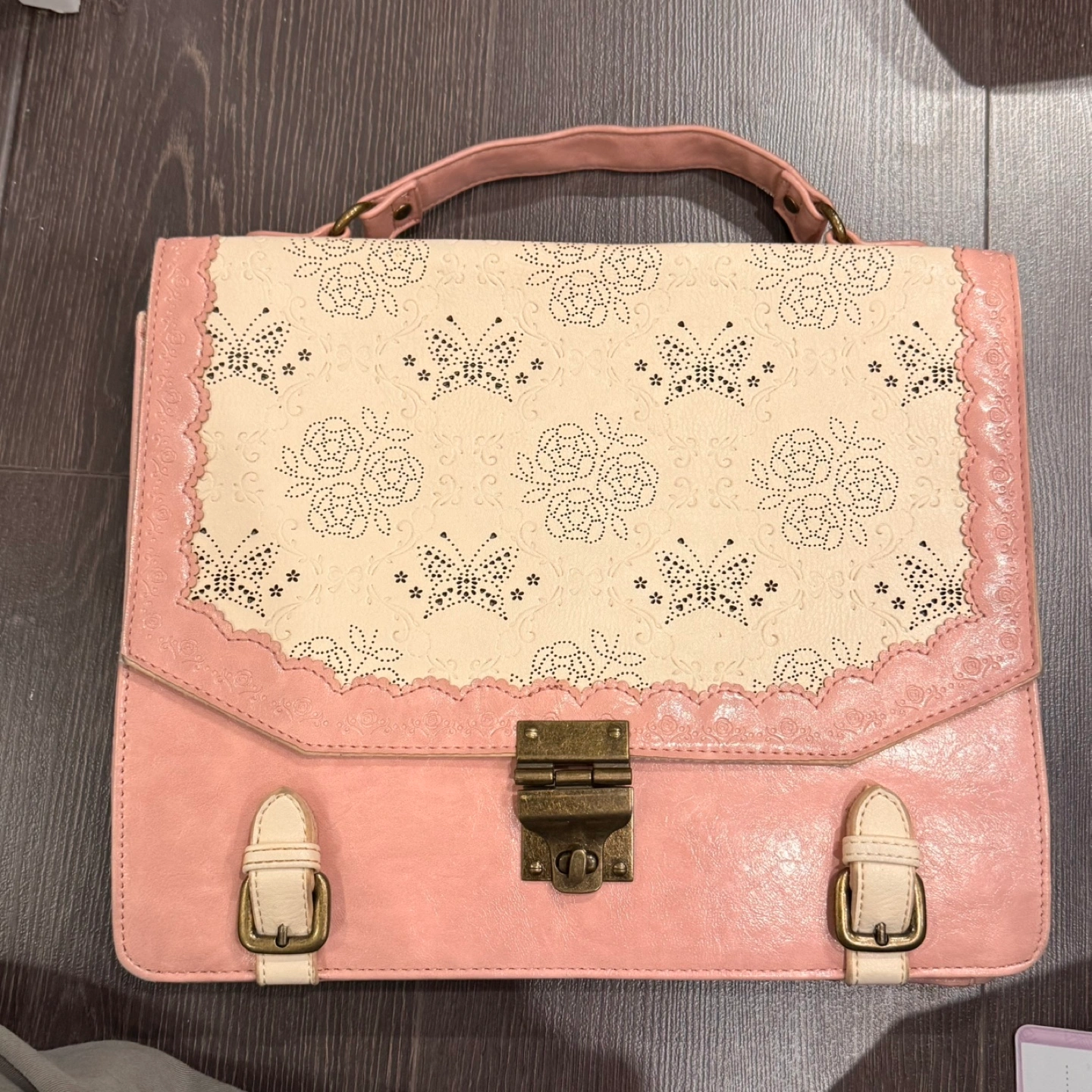 Cute pink satchel with a floral design and a detachable shoulder strap. The satchel has gold-tone hardware and features a flap closure with a lock. Can be used as holding bag, shoulder back, backpack