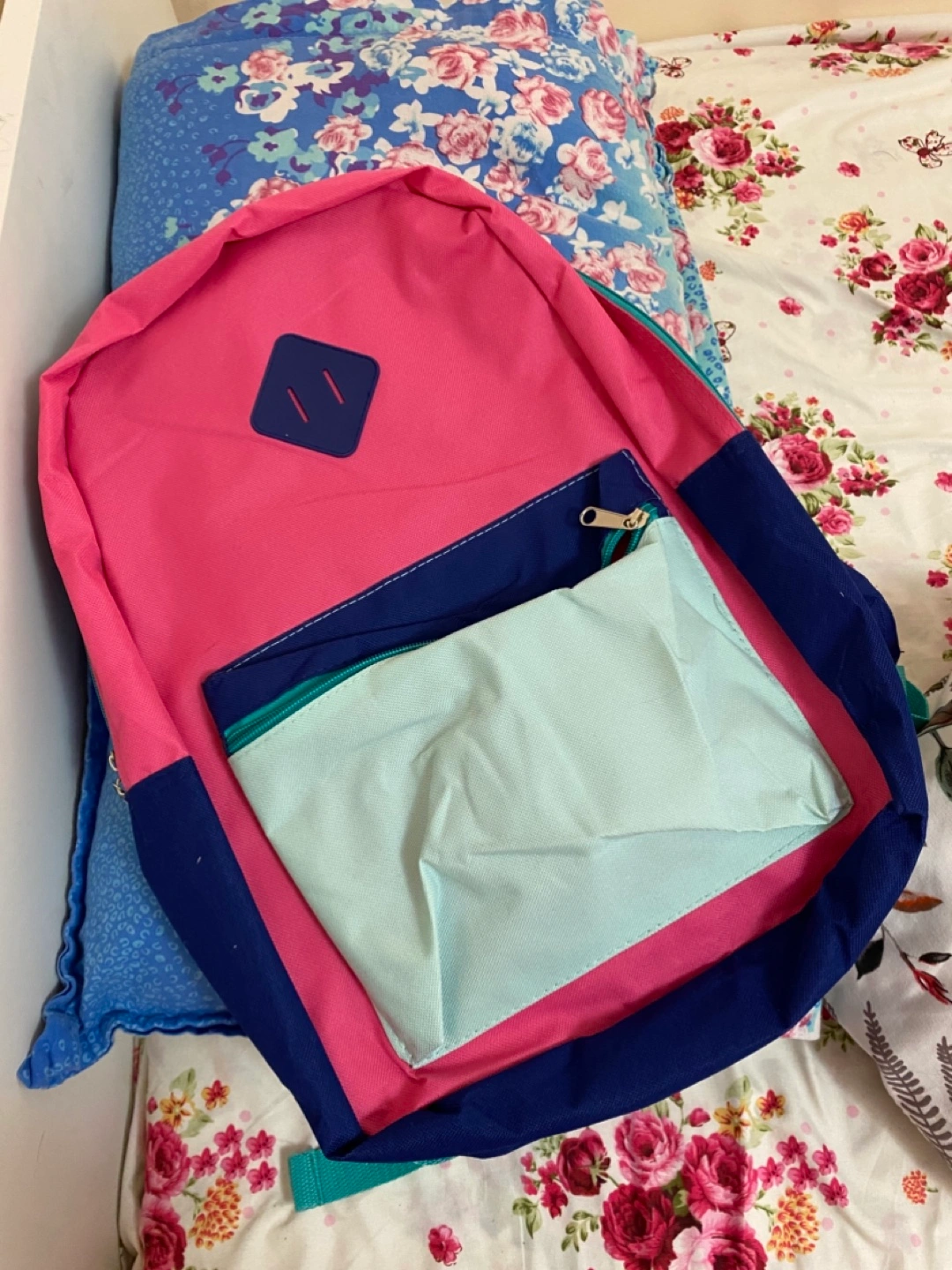 87Pink, blue, and teal backpack with a front zipper pocket. Great for school or travel. Moving sale
