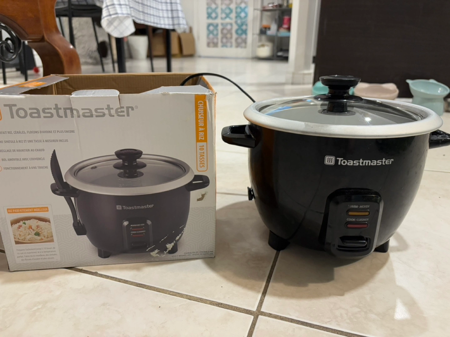 41510-cup rice cooker with a glass lid. Includes a rice paddle and a measuring cup. Features keep warm and cook functions. We bought a new one
