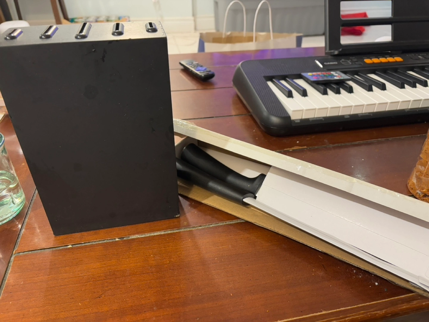 415Black knife block with 5 slots. Includes 5 knives. Might need to be sharpen