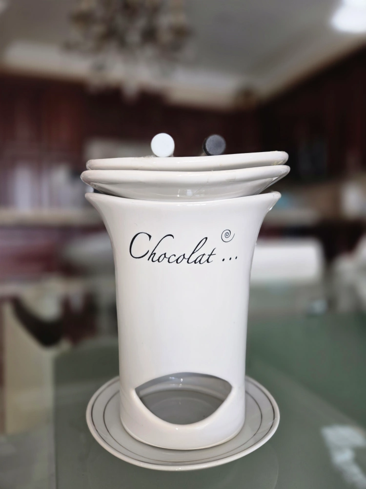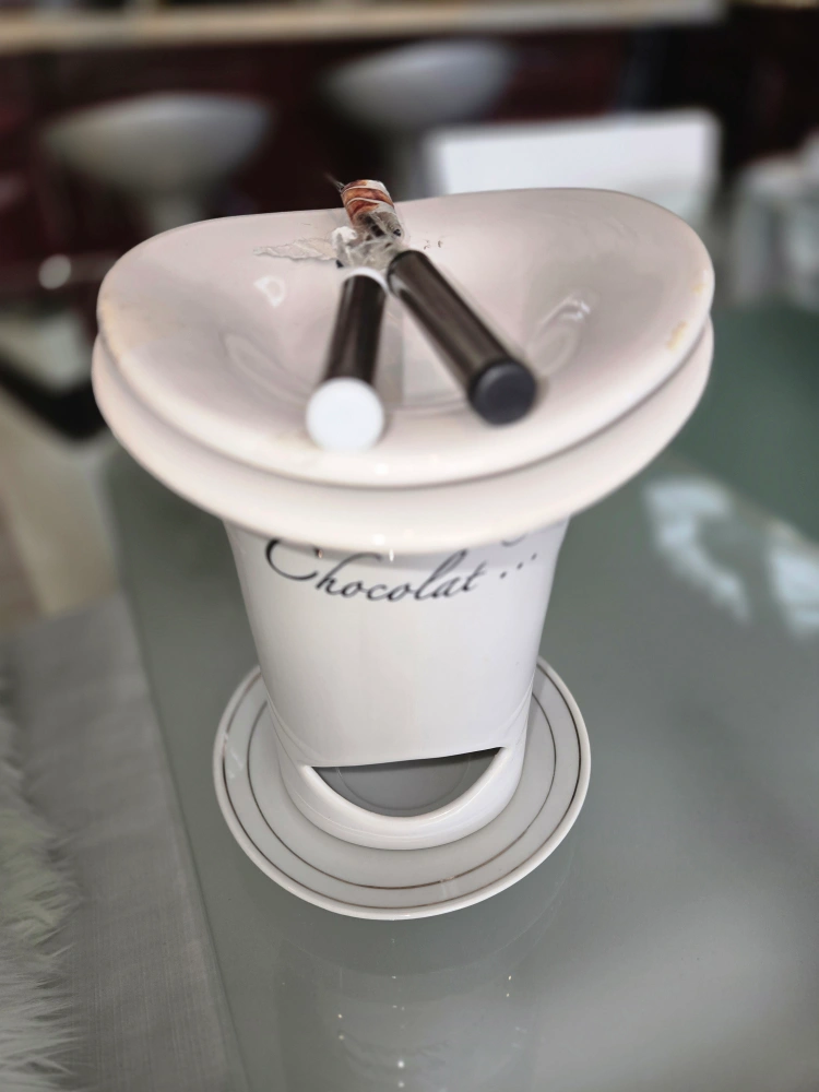 ♥️ White ceramic fondue set, includes a base with a candle holder, two dishes and two fondue forks. Treat yourself 🎁 for Valentines day ♥️