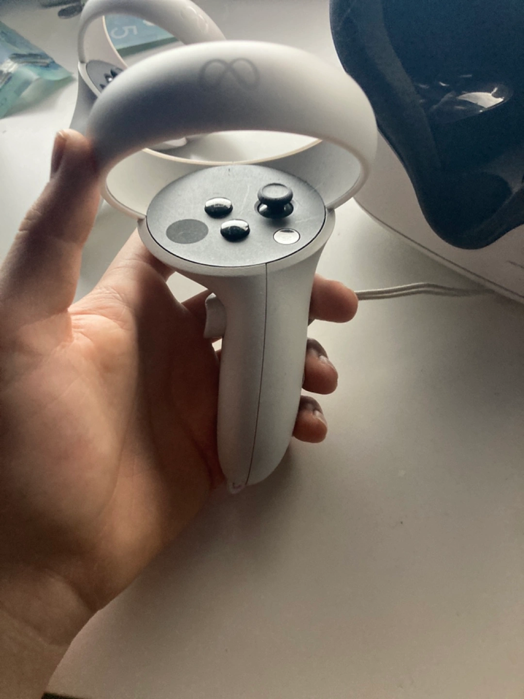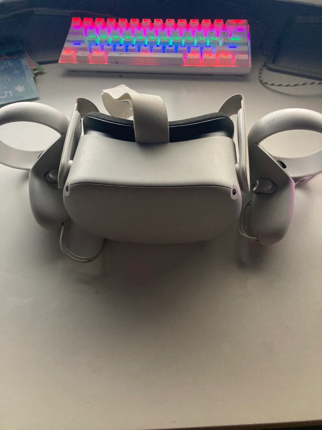 Meta Quest 2 VR headset and controllers. Includes facial interface. Used but in good condition. Comes with charger