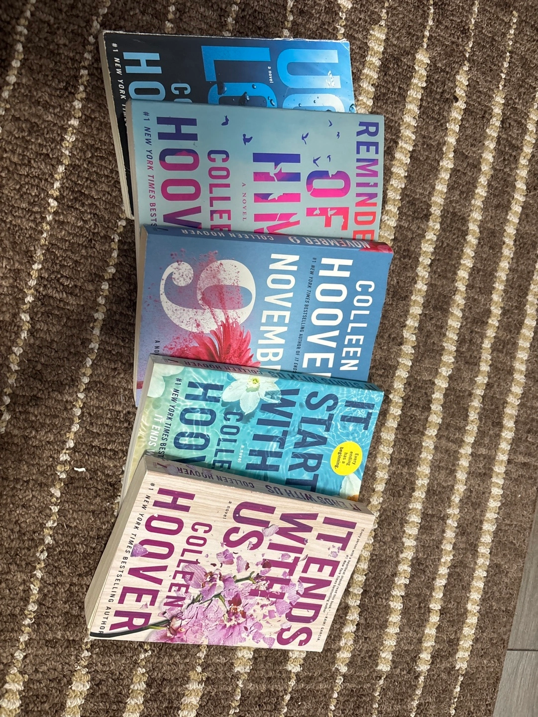 Set of 5 Colleen Hoover books. Titles include: Ugly Love, Reminders of Him, It Ends With Us, It Starts With Us, and November 9.