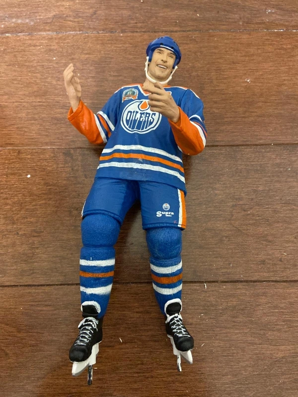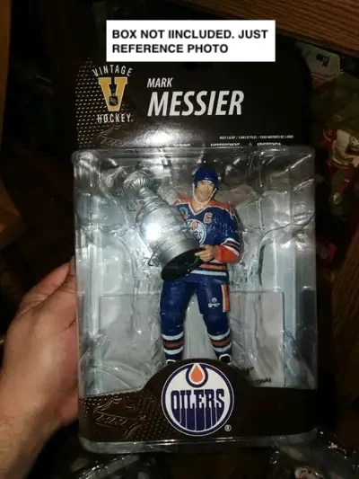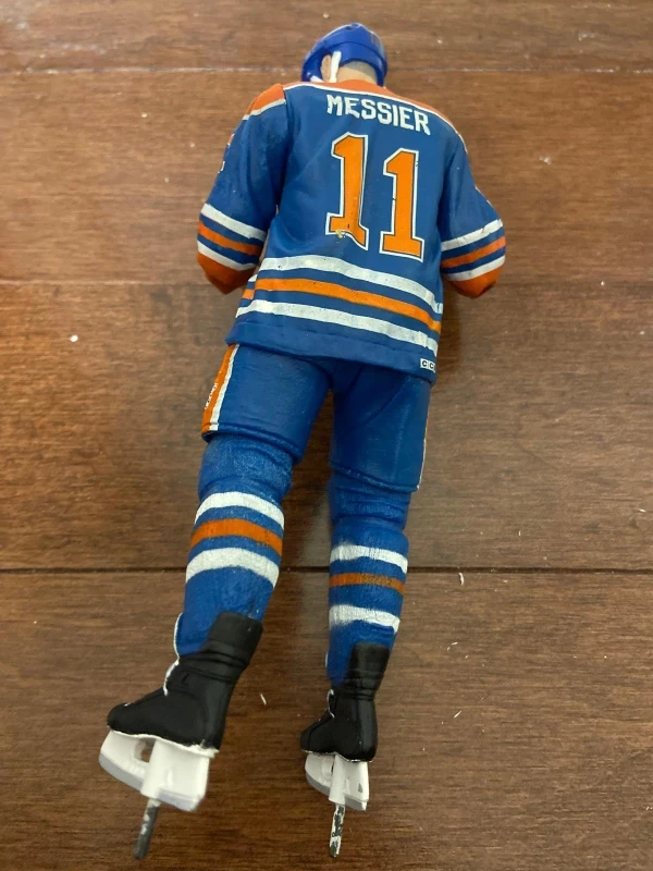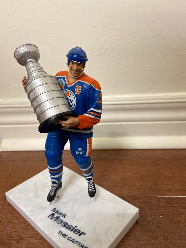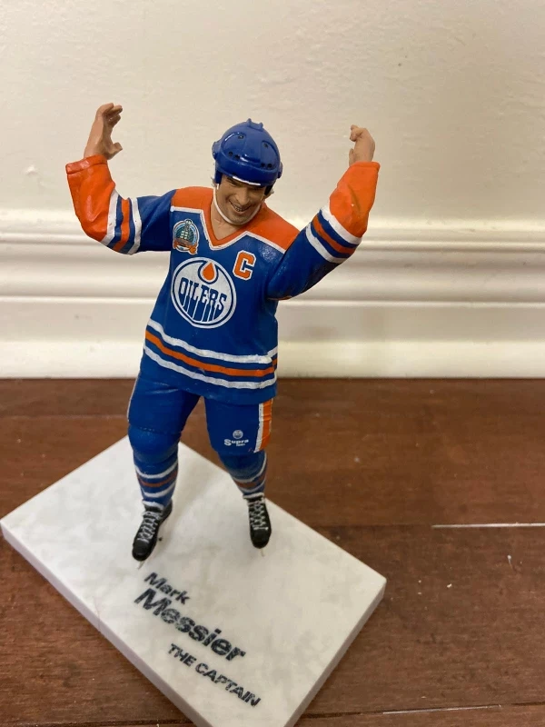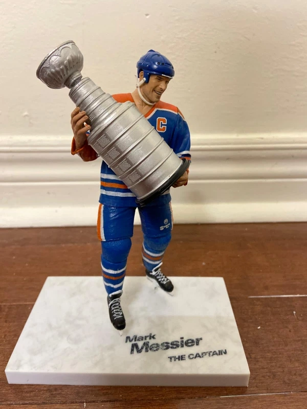 Representing the Oilers' winning days with the legendary captain of the 1990 cup winning team, Mark Messier. Figure stands 6 3/4 inches at top of cap. Articulated at shoulders and thighs. Includes Stanley Cup and 6-inch wide by 3 1/2-inch deep base with player name ("Mark Messier - the Captain"). 20.32 x 18.03 x 9.14 cm; approx 249.48 g