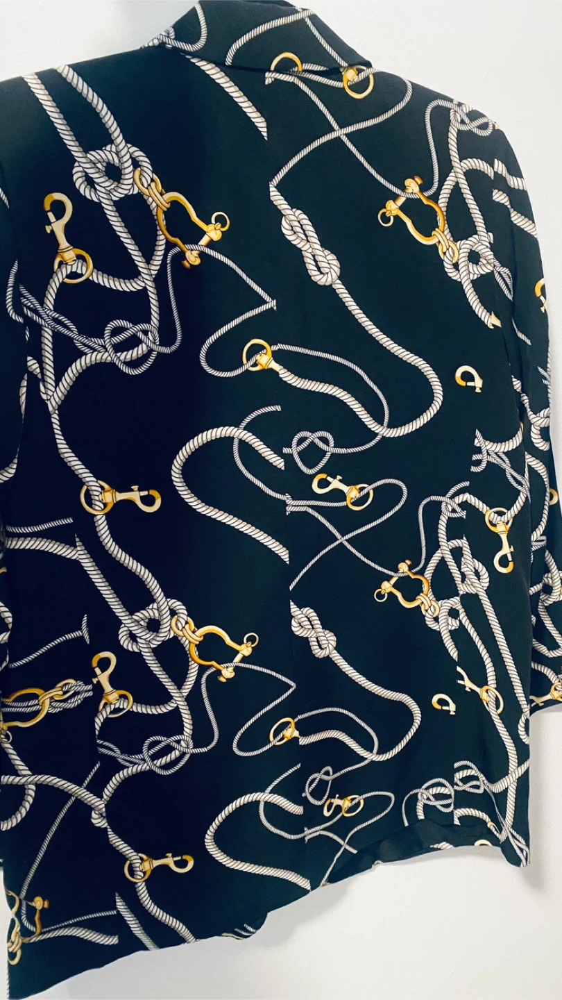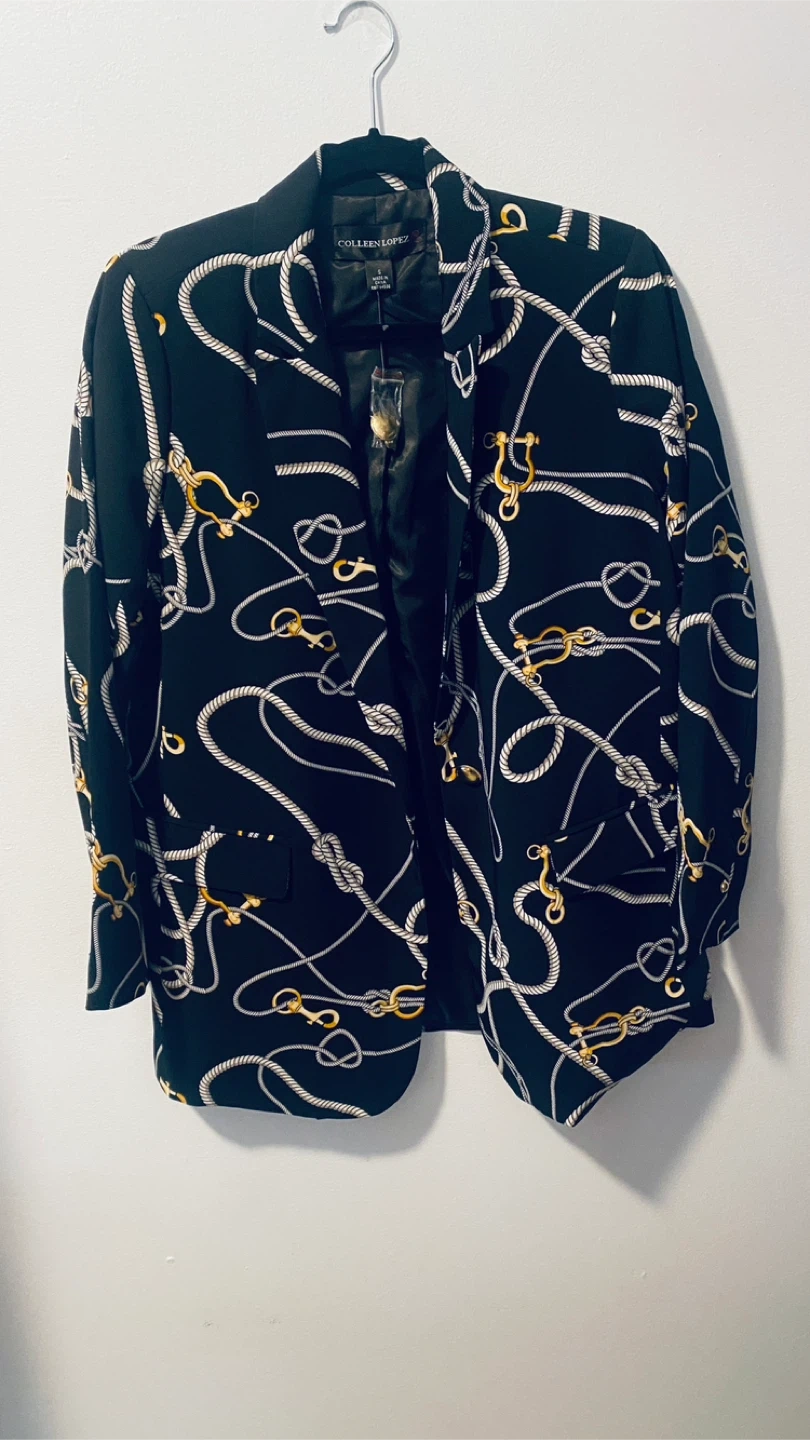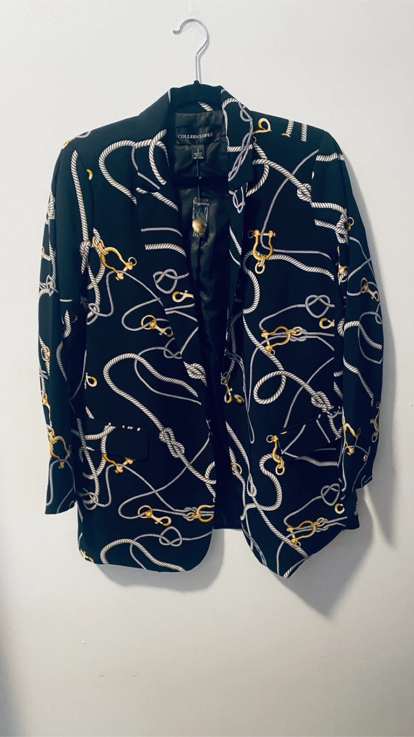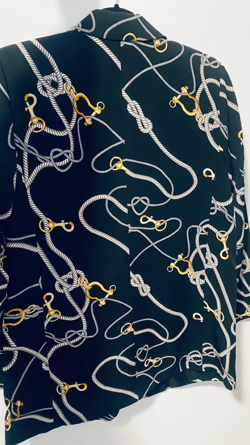 Black blazer with a white and gold rope print. Long sleeves, two pockets.