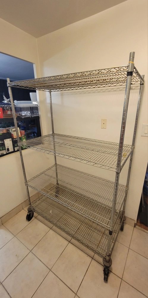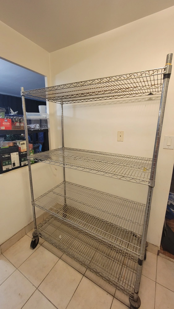 Metal shelving unit with 4 shelves and wheels. in used condition.
