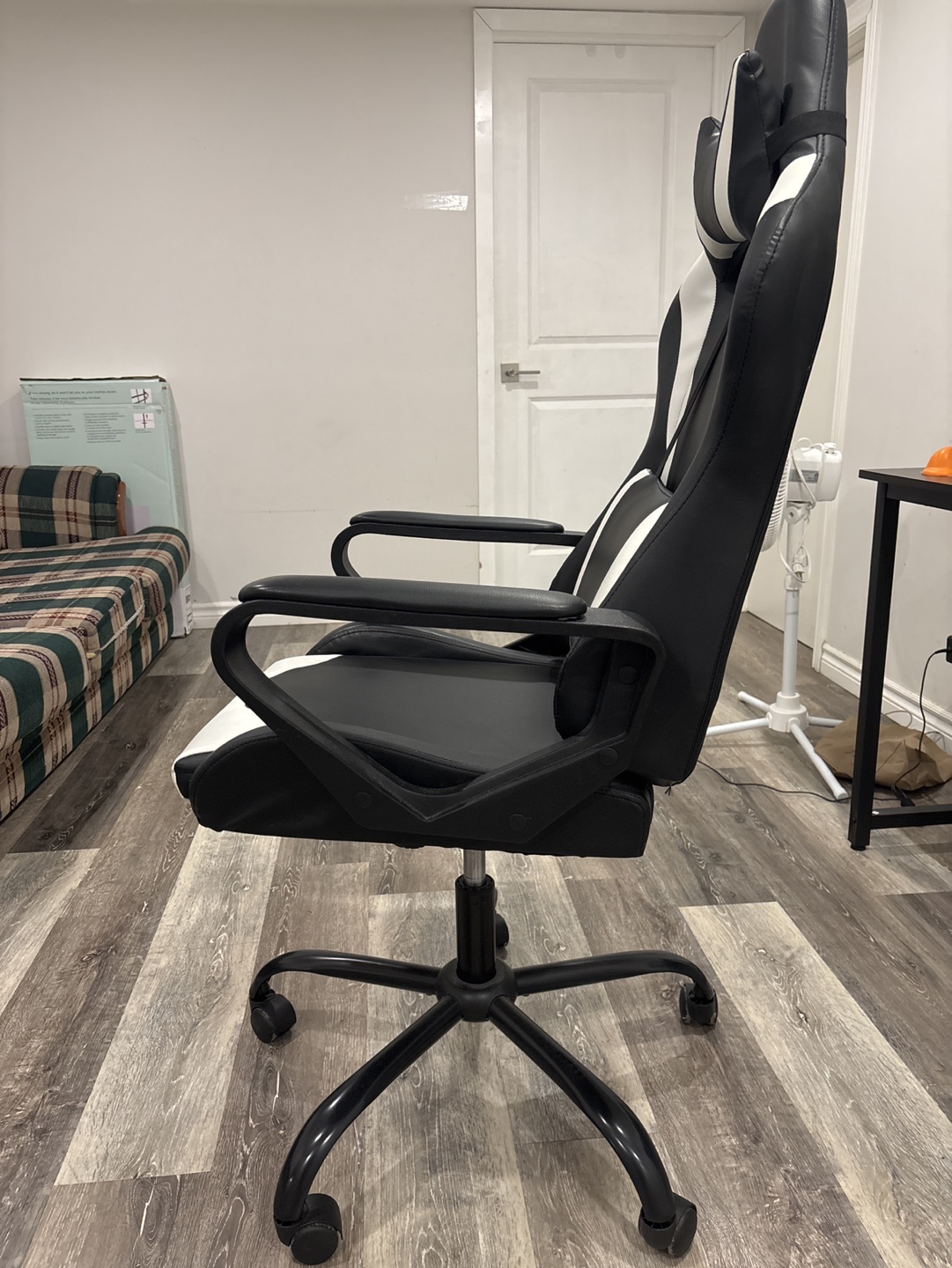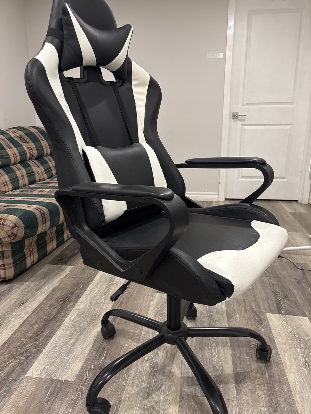 Black and white gaming chair with headrest and lumbar support. Adjustable height and swivel base. On wheels.