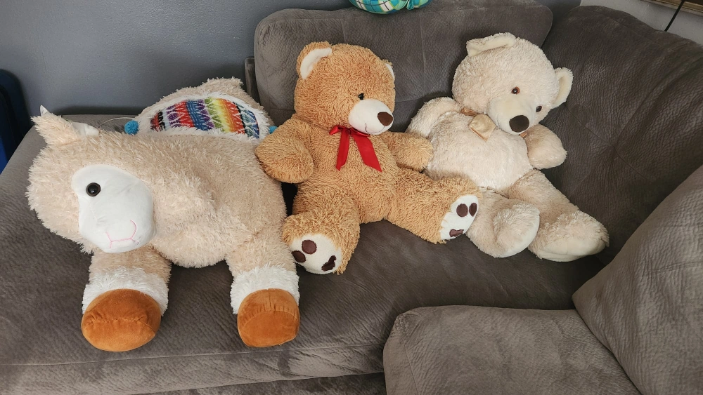 202Large plush stuffed animals. One llama, one brown bear and one white bear.