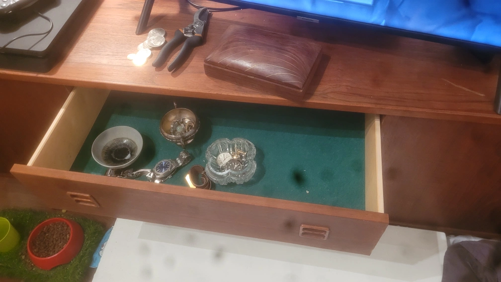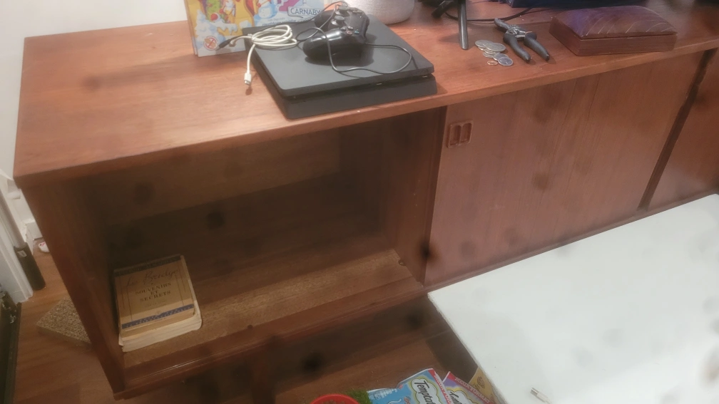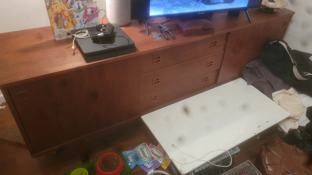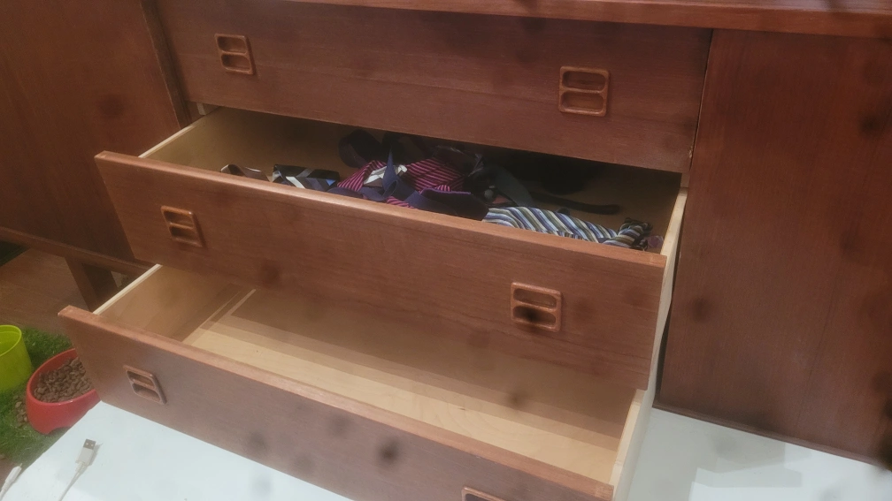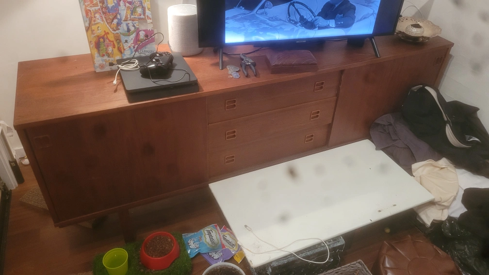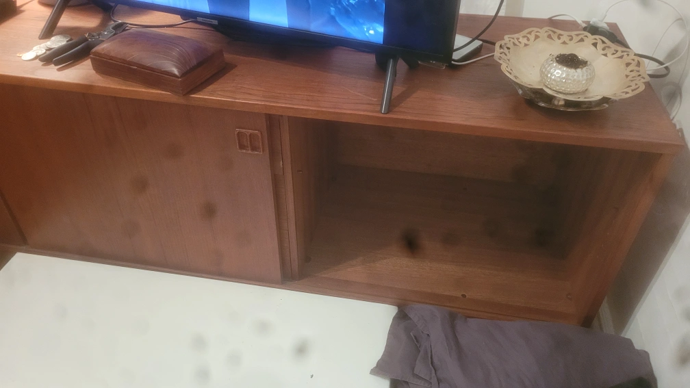 116Mid century modern teak credenza with sliding doors, three drawers, top one still with velvet in it. very good condition, light water damage on surface from previous owner but otherwise excellent condition. Apologies for photo quality, in the process of moving. Won't fit in new space and don't really want to store it.