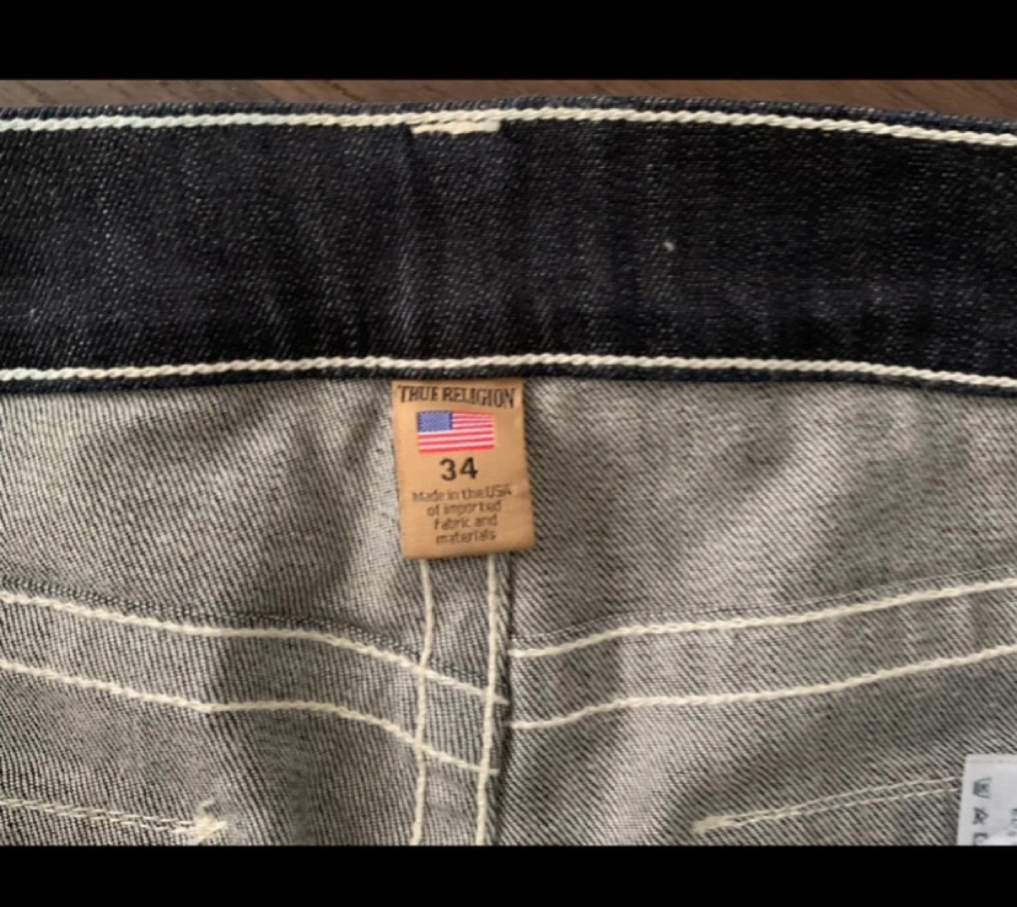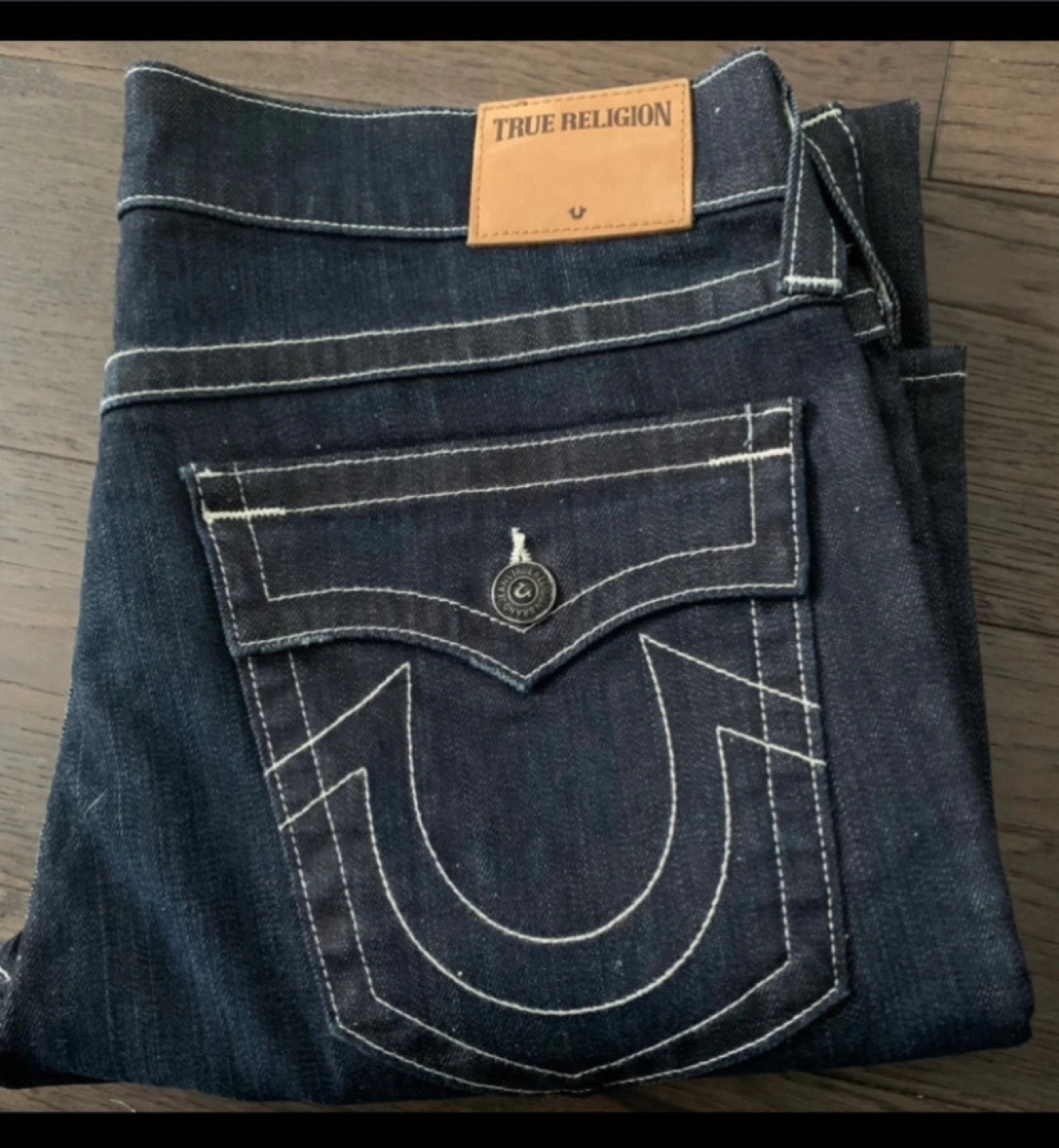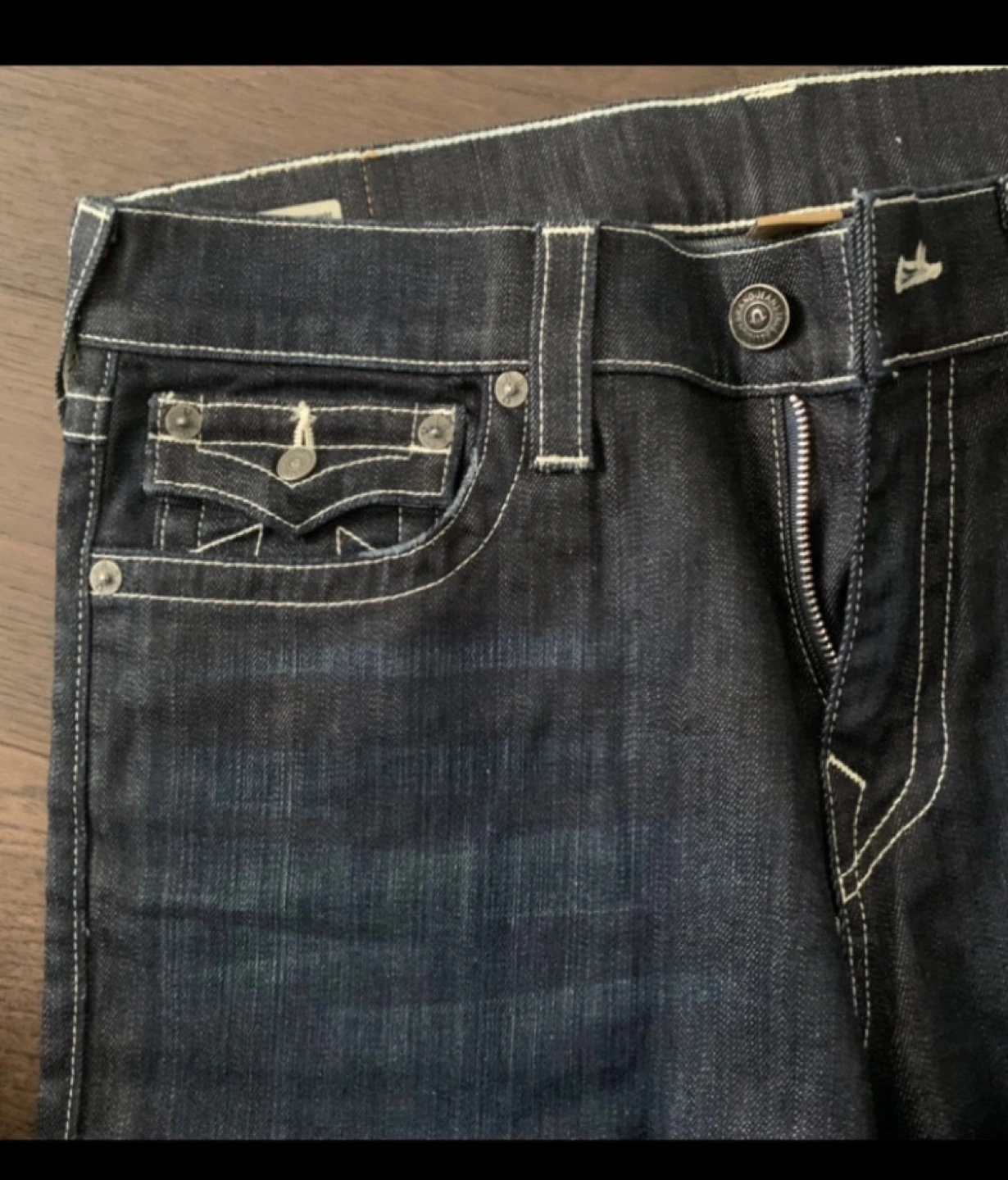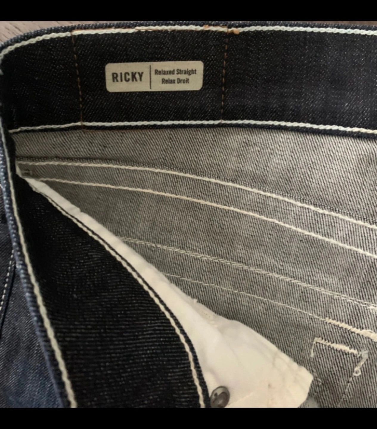 Size W34. Relaxed straight fit. Dark wash with white stitching.