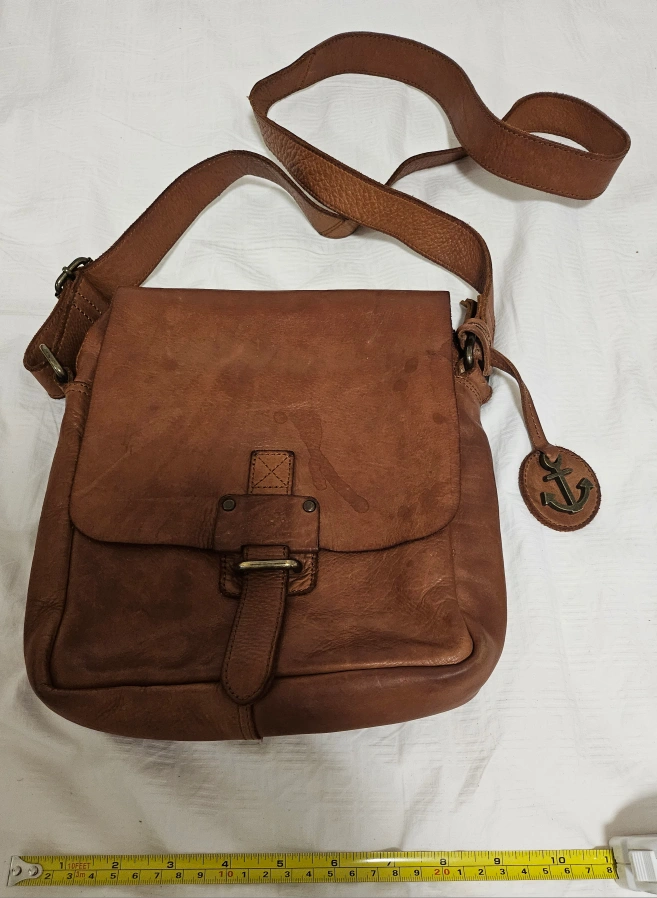 Brown leather crossbody bag with a zippered closure and an adjustable strap. Features a metal anchor logo on the front and a zippered pocket inside.