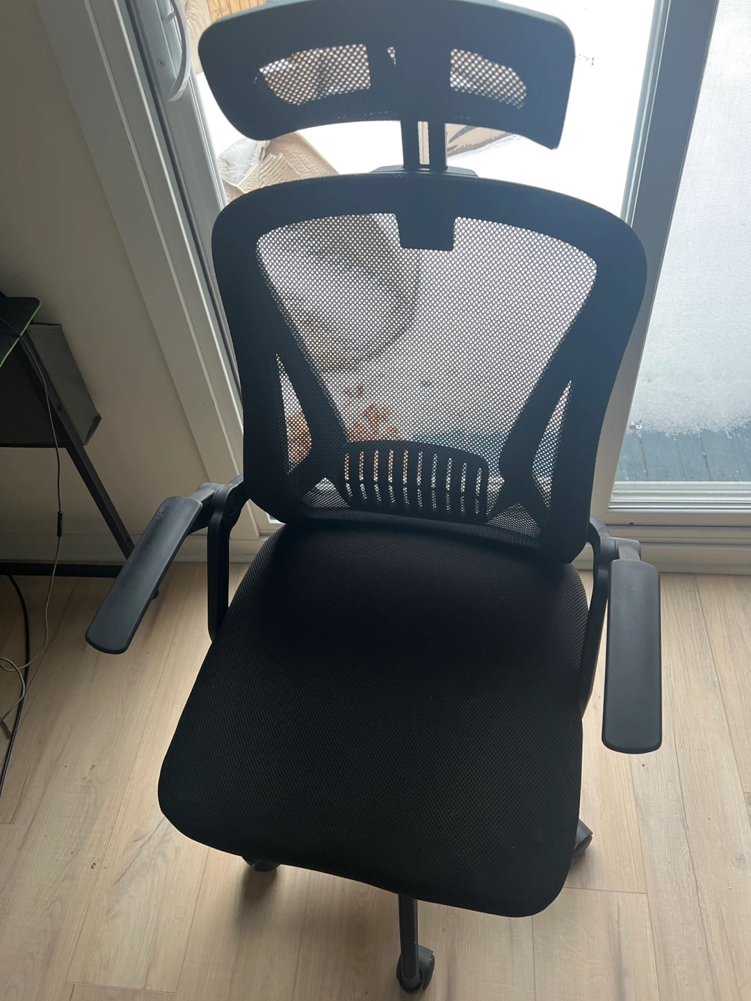 Black mesh office chair with headrest and adjustable arms. Has wheels and a swivel base. Arms move up and down as well as the headrest.