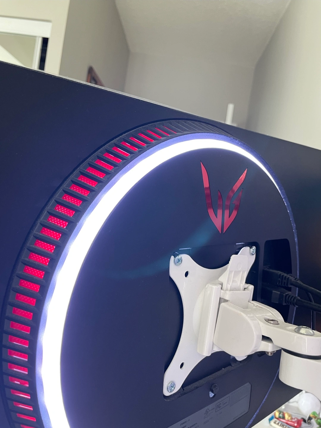 LG UltraGear 27 Inch 4K IPS 144Hz 1ms Gaming Monitor with a built-in light ring. The monitor is in good condition and comes with the stand.