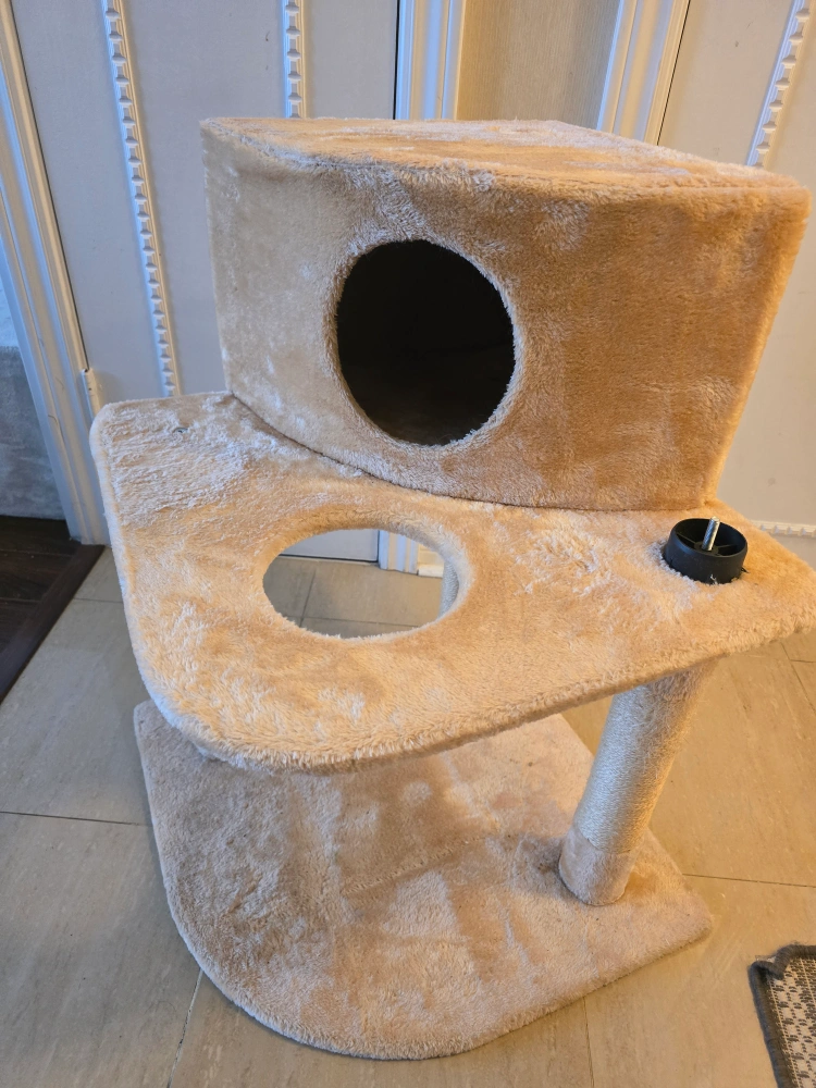 Beige cat tree condo with scratching posts, a platform, and a cubby.