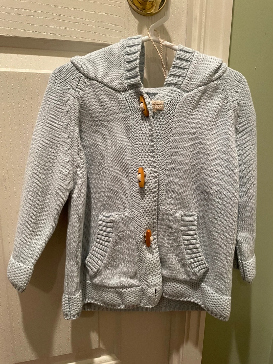 Light blue hooded cardigan sweater with wooden toggles. 100% cotton. Size 18-24 months. Tags still on so can be gifted.