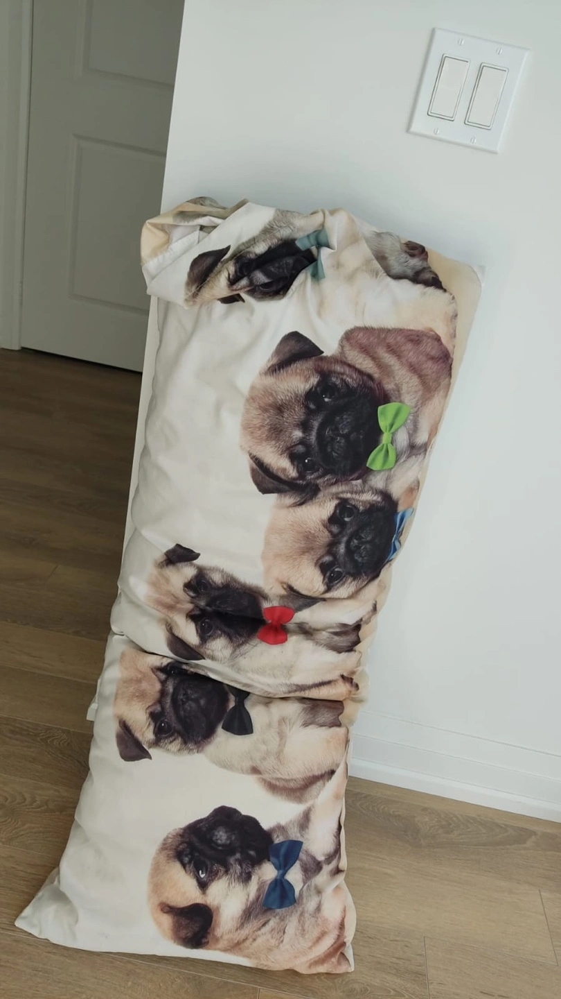 #freecycle pillow cover featuring pugs. White background with pugs wearing bowties.