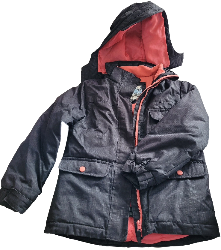 Black winter ski jacket with a pink lining. Has two front pockets and a hood. waist band to keep the cold and snow out.