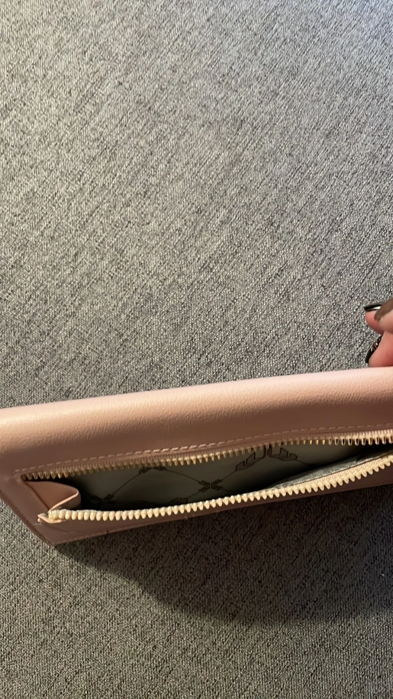 Pink leather wallet with gold zipper and hardware. Features multiple card slots and a zippered compartment.