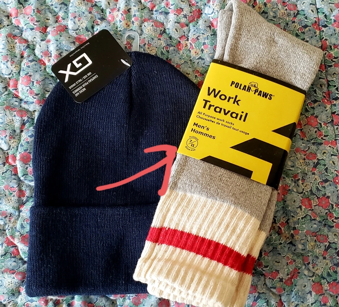 Navy blue beanie and a pair of grey Polar Paws work socks. Socks are size 7-11