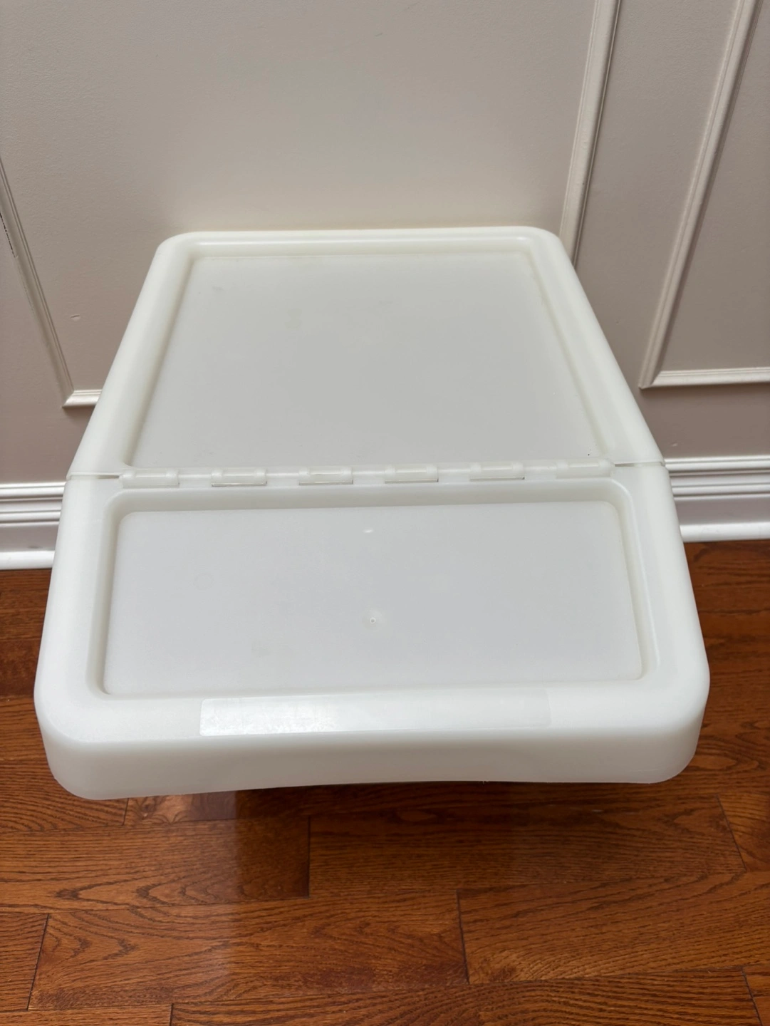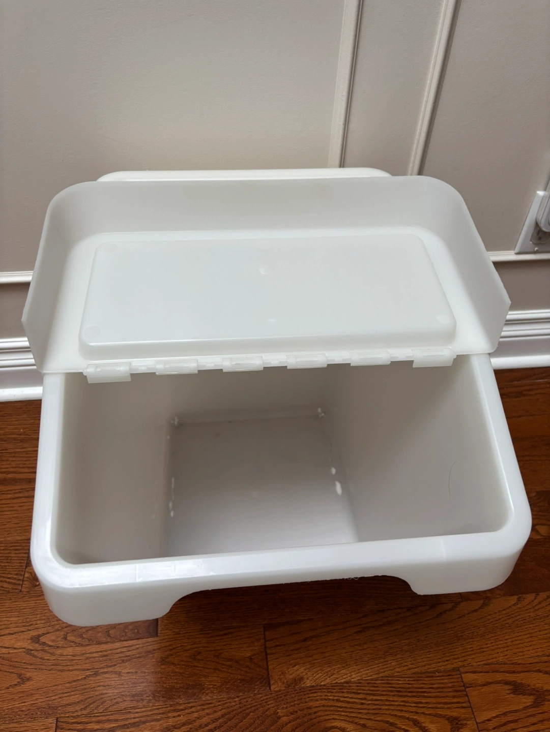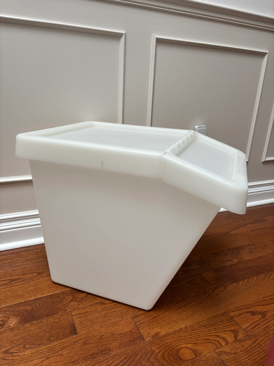 White plastic waste bin with a flip-top lid.