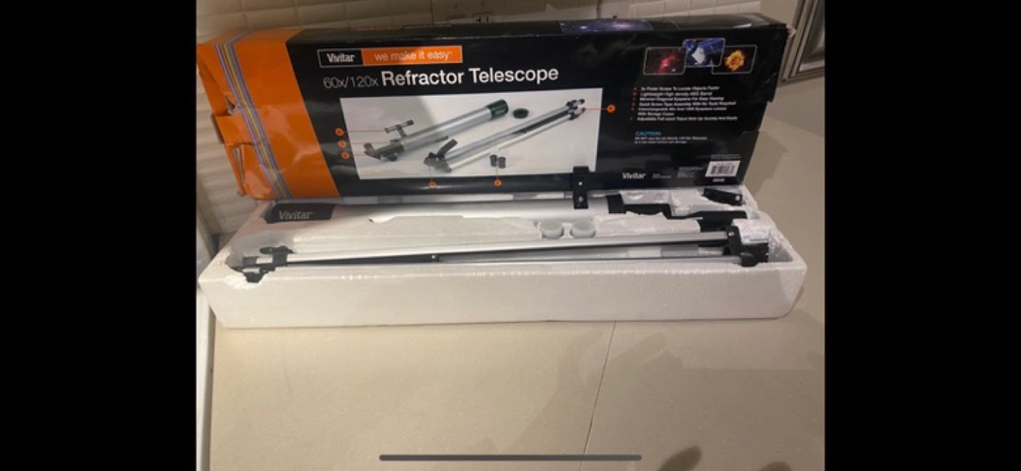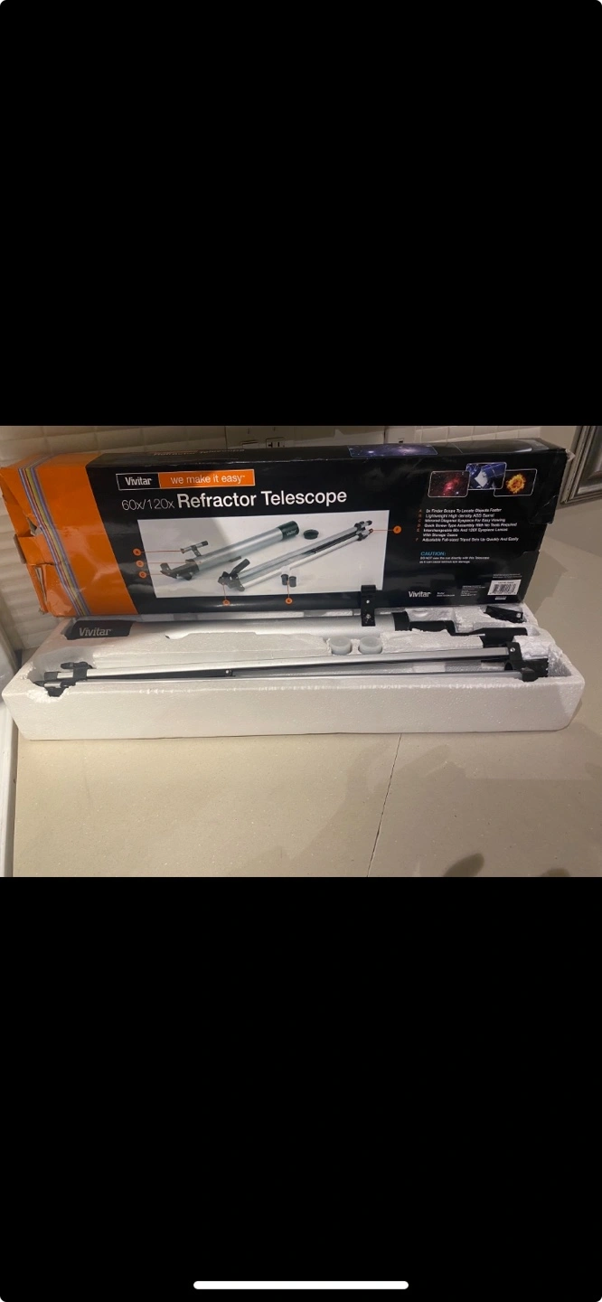 Refractor telescope with a 60x/120x magnification. Telescope comes in original box and appears to be unused. #freecycle …I would like to bring more quality time to a parent and child exploring the stars…than simply video games or computers
