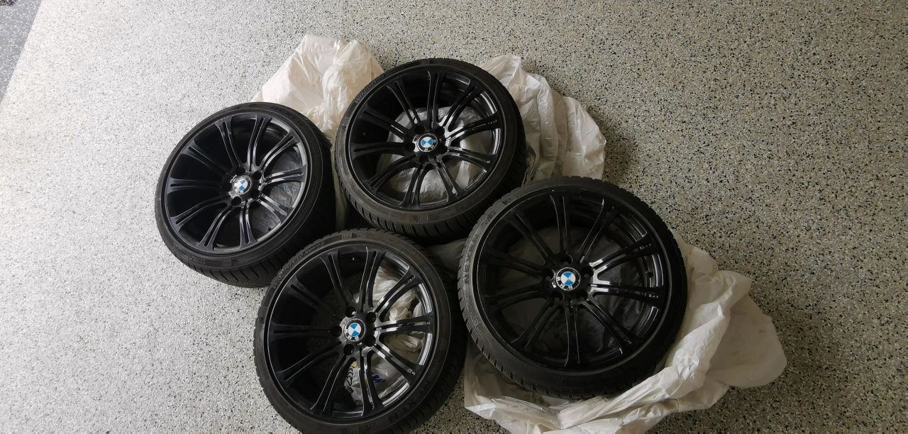 Set of four black 19" BMW wheels with tires. Includes centre caps. Were on BMW m3 but will fit any BMW that uses 19" Wheels.