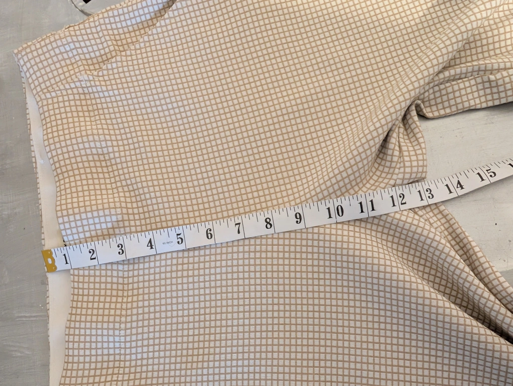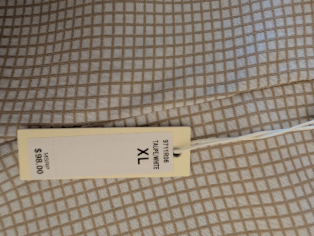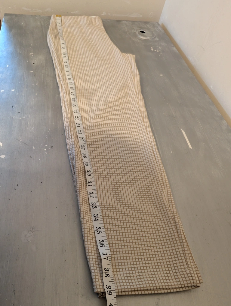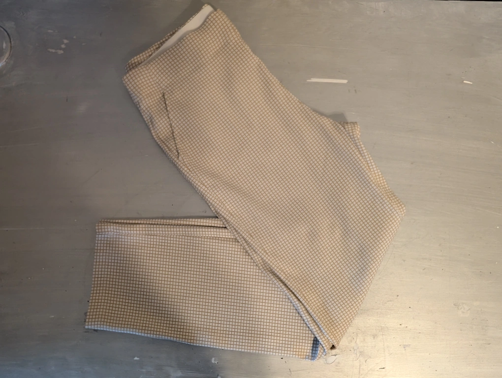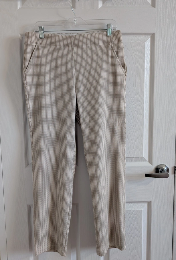 White and brown checkered pants with a straight leg. Has pockets on the front. Size XL