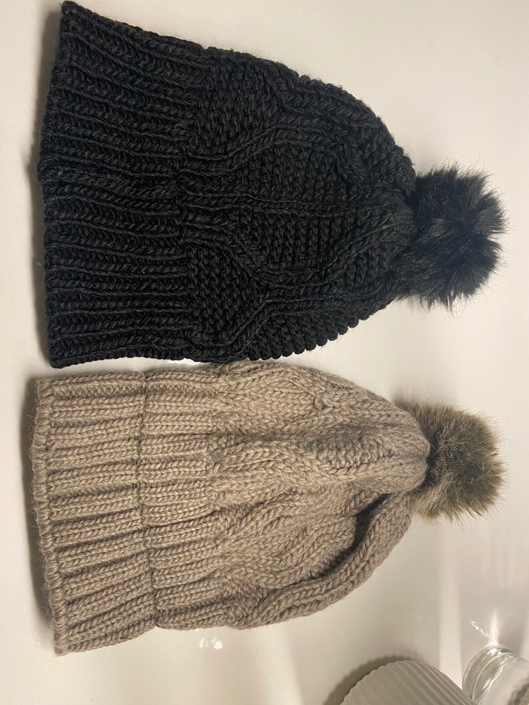 Two knitted beanies with pompom accents. One is black and one is beige. Both are in good condition Washed. Each-$5 Both buying -$8