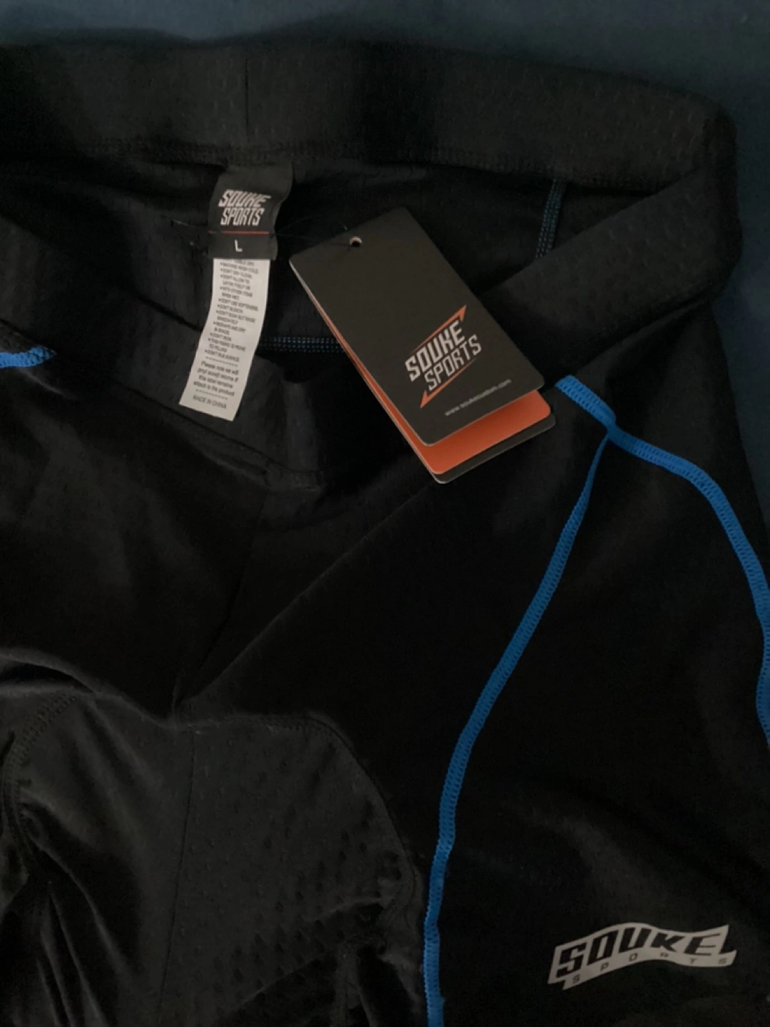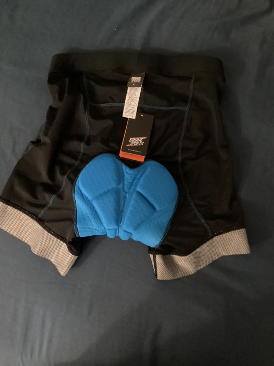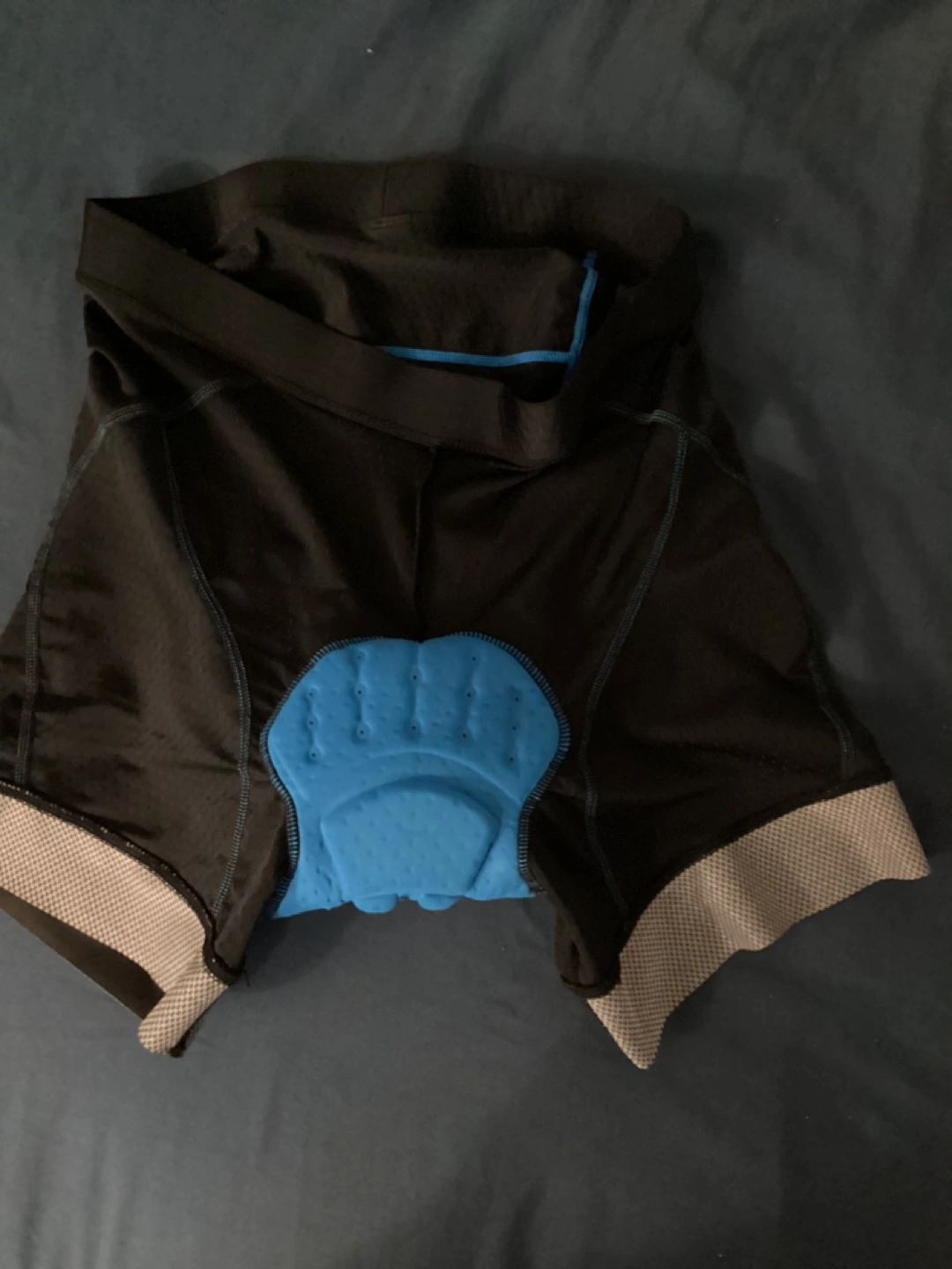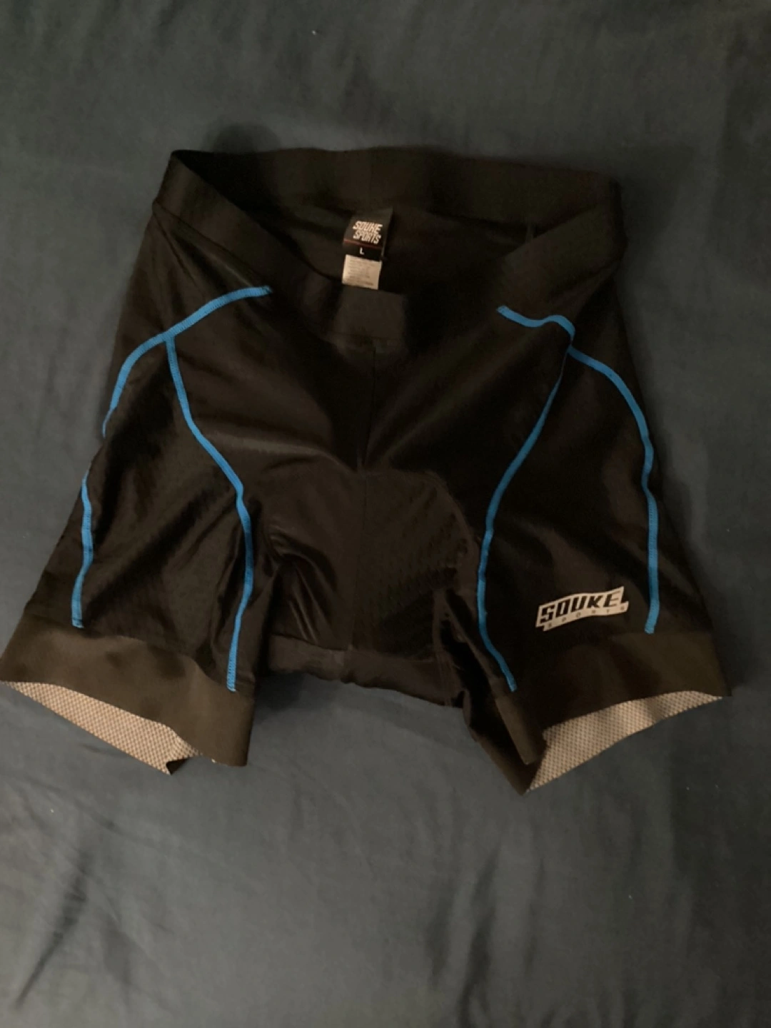 Black cycling shorts with blue trim. They have a padded seat for comfort. Size L.