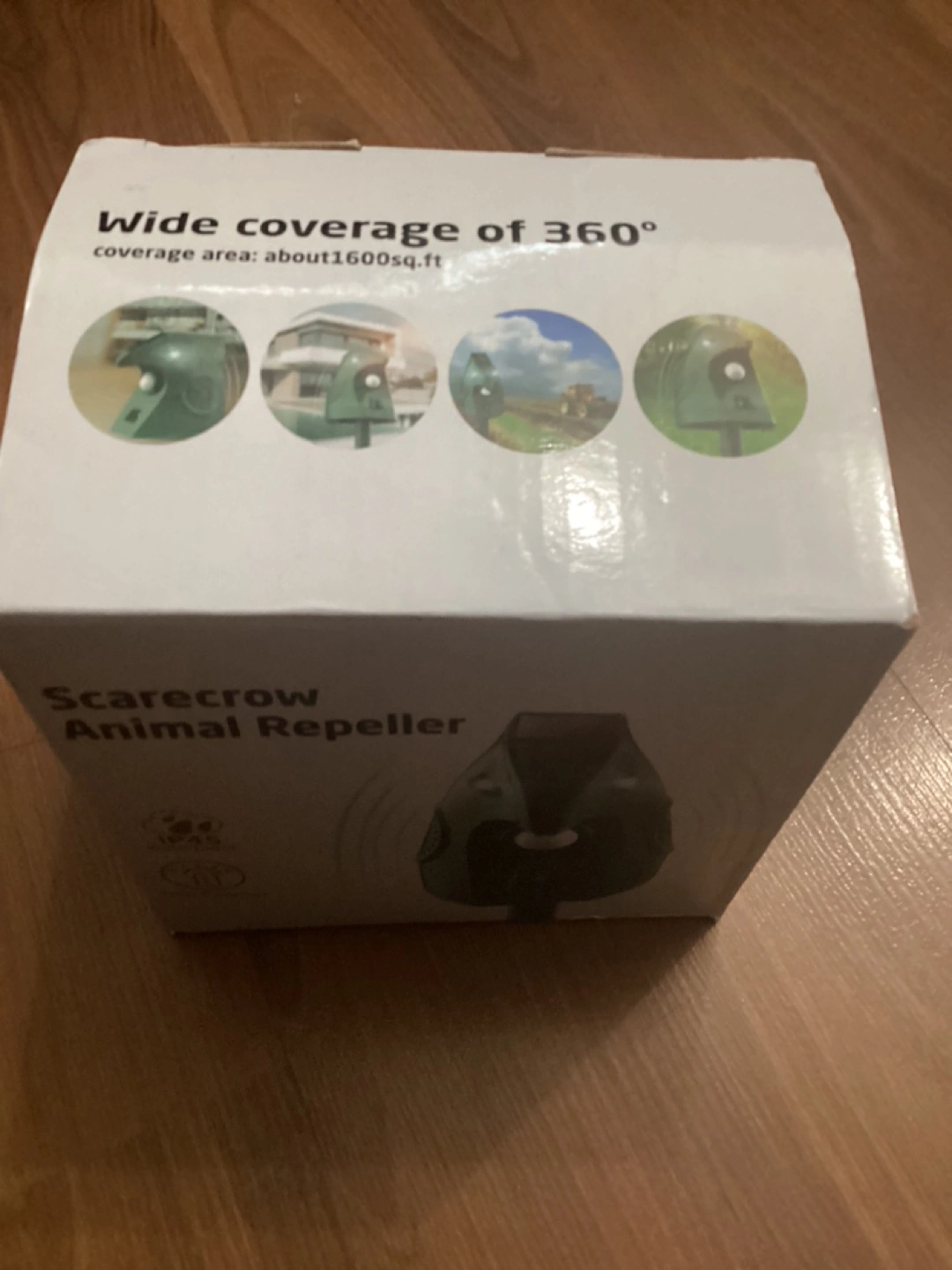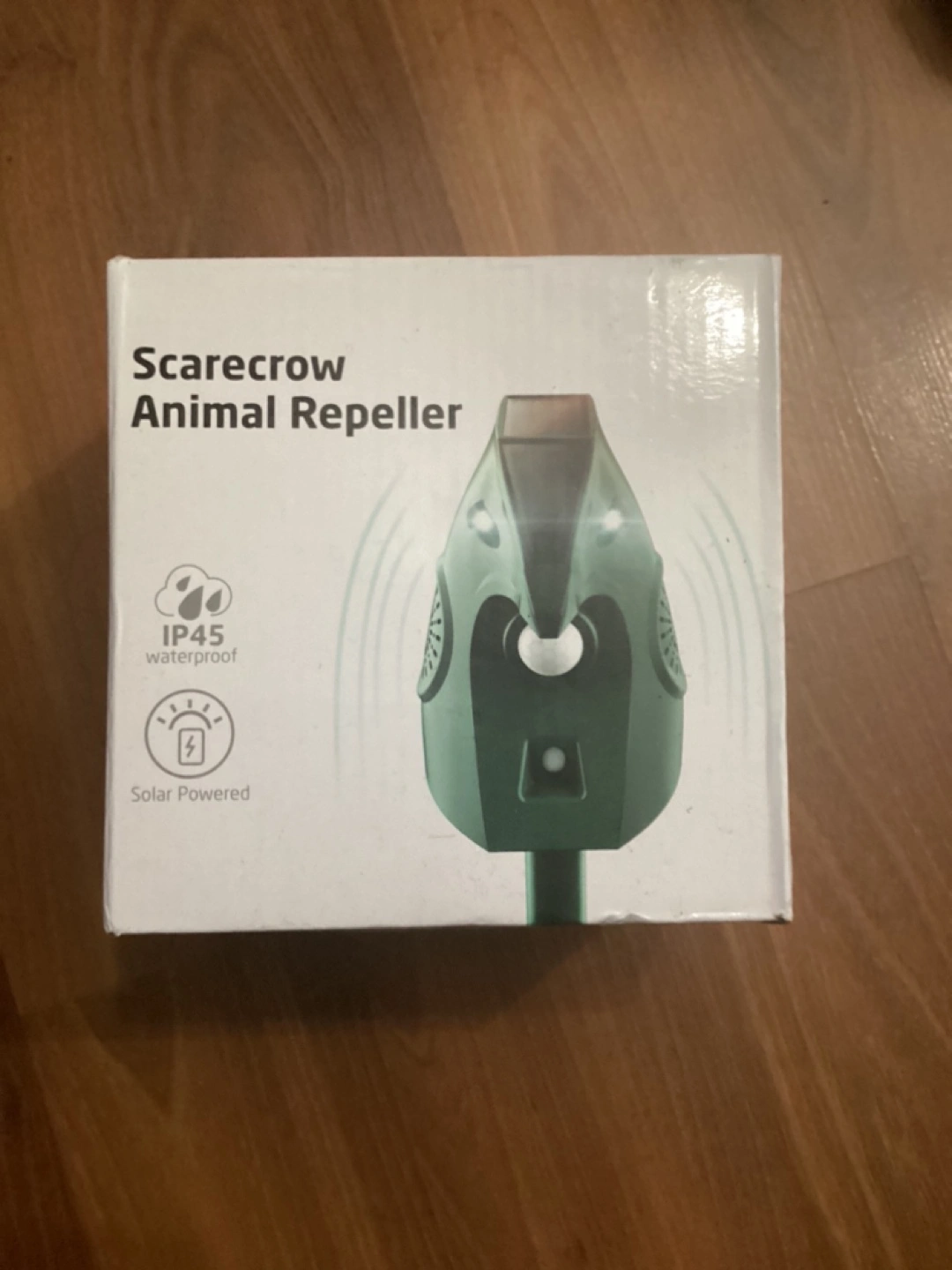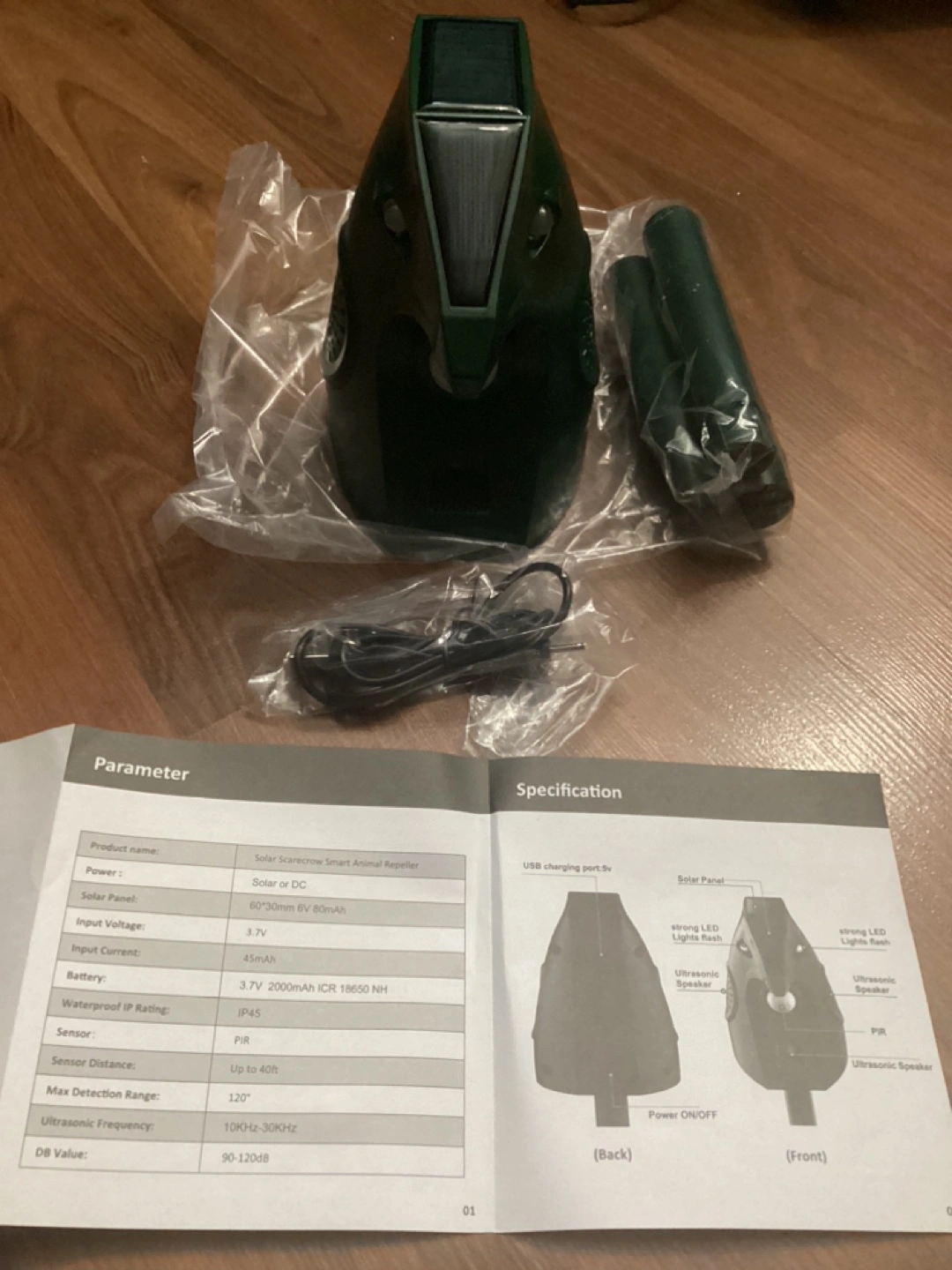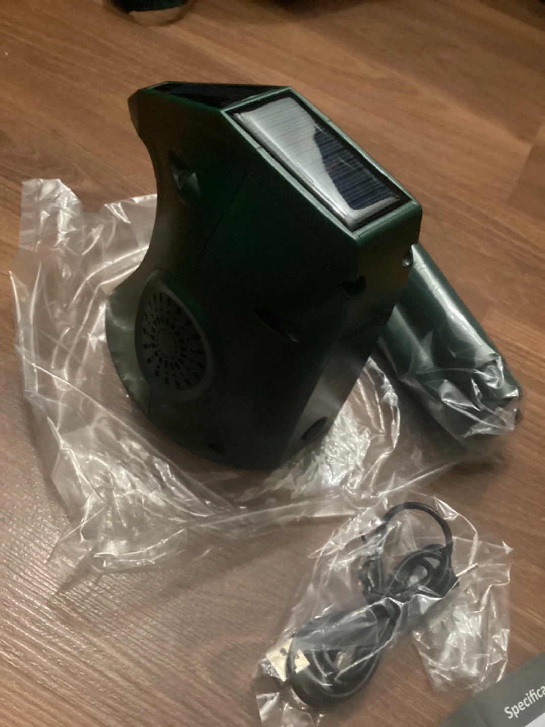 Solar powered, waterproof animal repeller. Includes USB charging port, solar panel and motion sensor.