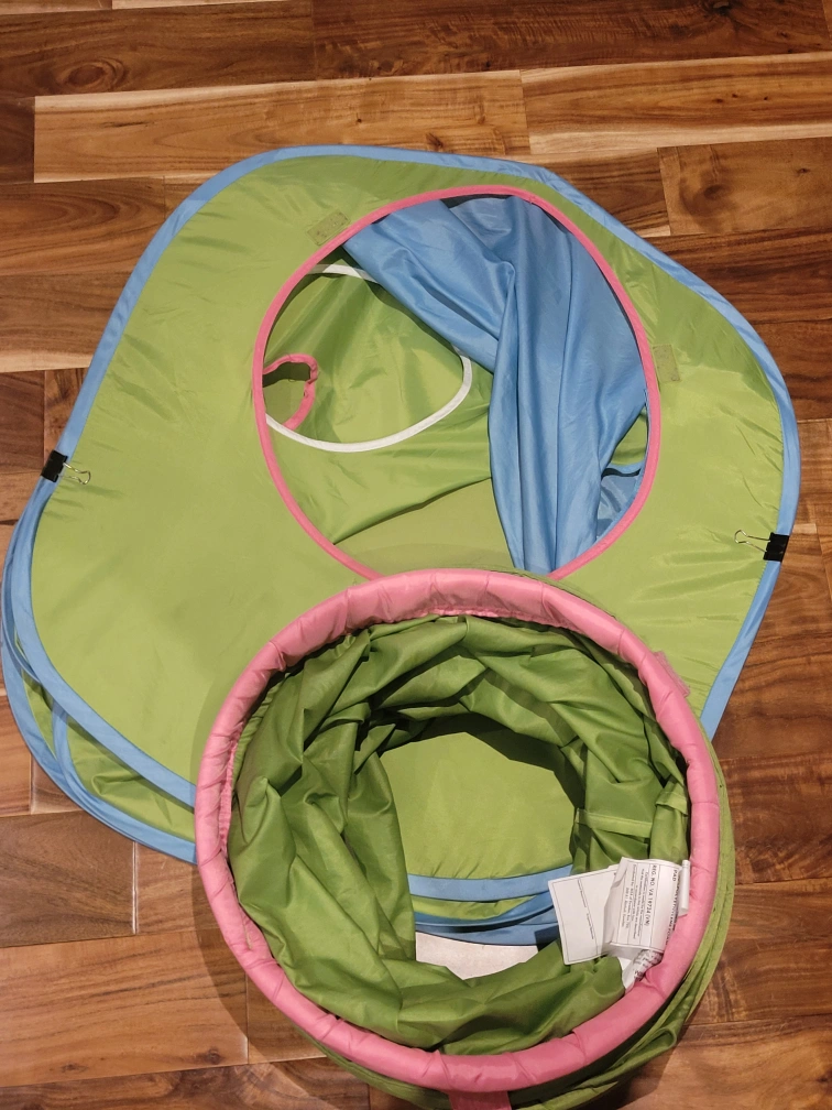 Super fun Green and pink play tunnel and tent. Fold flat for storage.