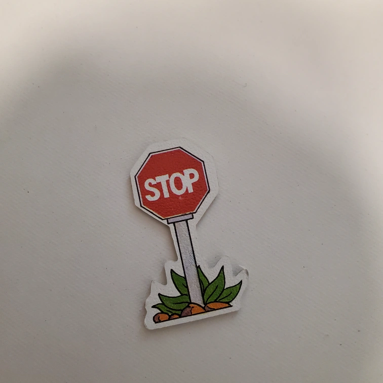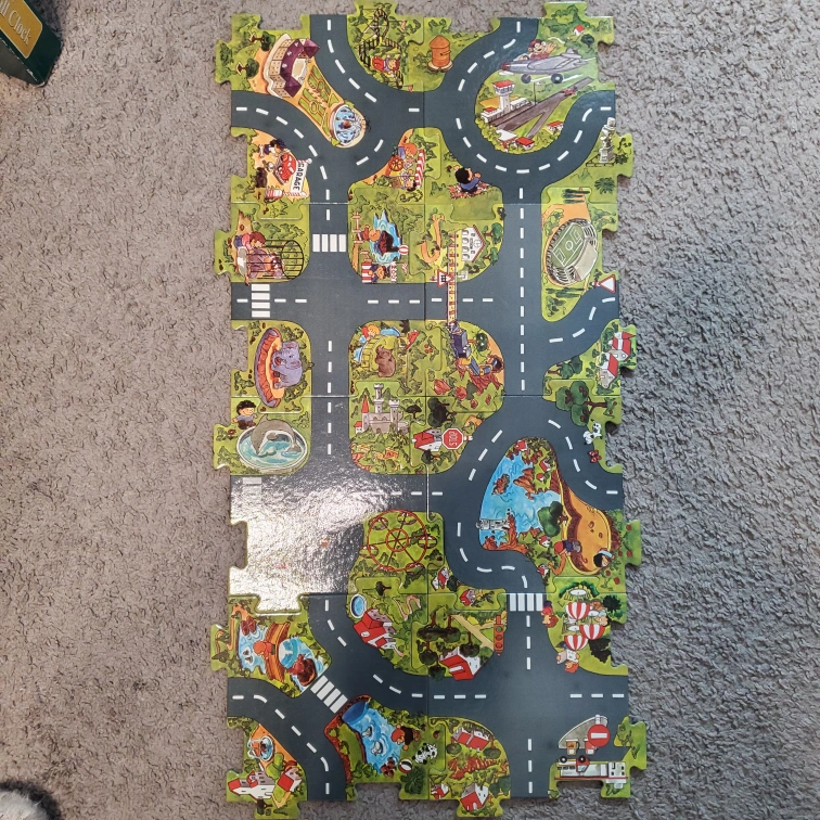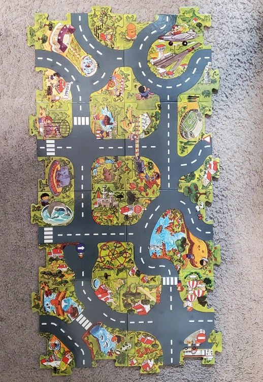 Floor puzzle with a road theme. Includes a variety of different images, including animals, buildings, and vehicles. This set is missing the bases for the stop signs and other accessories.