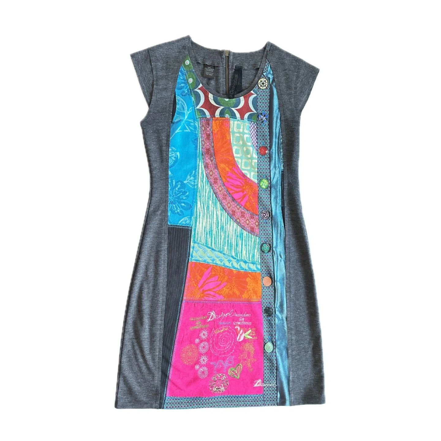 Desigual Patchwork Dress Geometric Pattern Grey Blue Size Small
