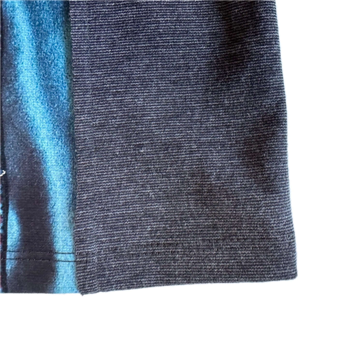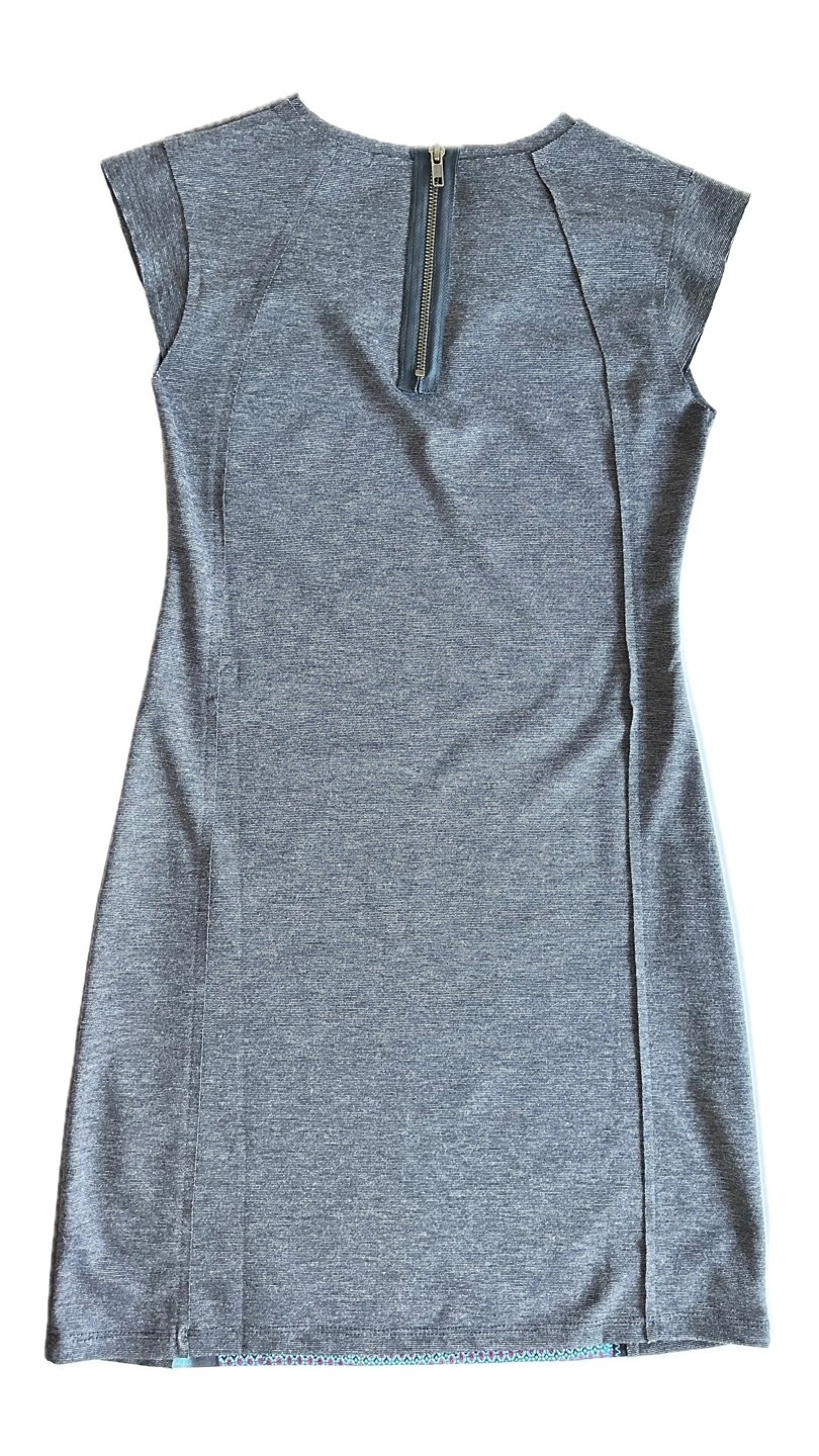 Grey short-sleeved dress with a patchwork design and a zipper on the back. The dress has a variety of colourful patterns.