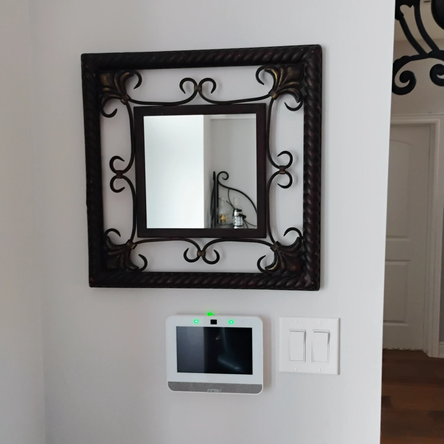 Decorative wall mirror with a dark, ornate frame featuring scrolled metalwork. It's a lovely accent piece for any room. The frame appears to be made of metal.