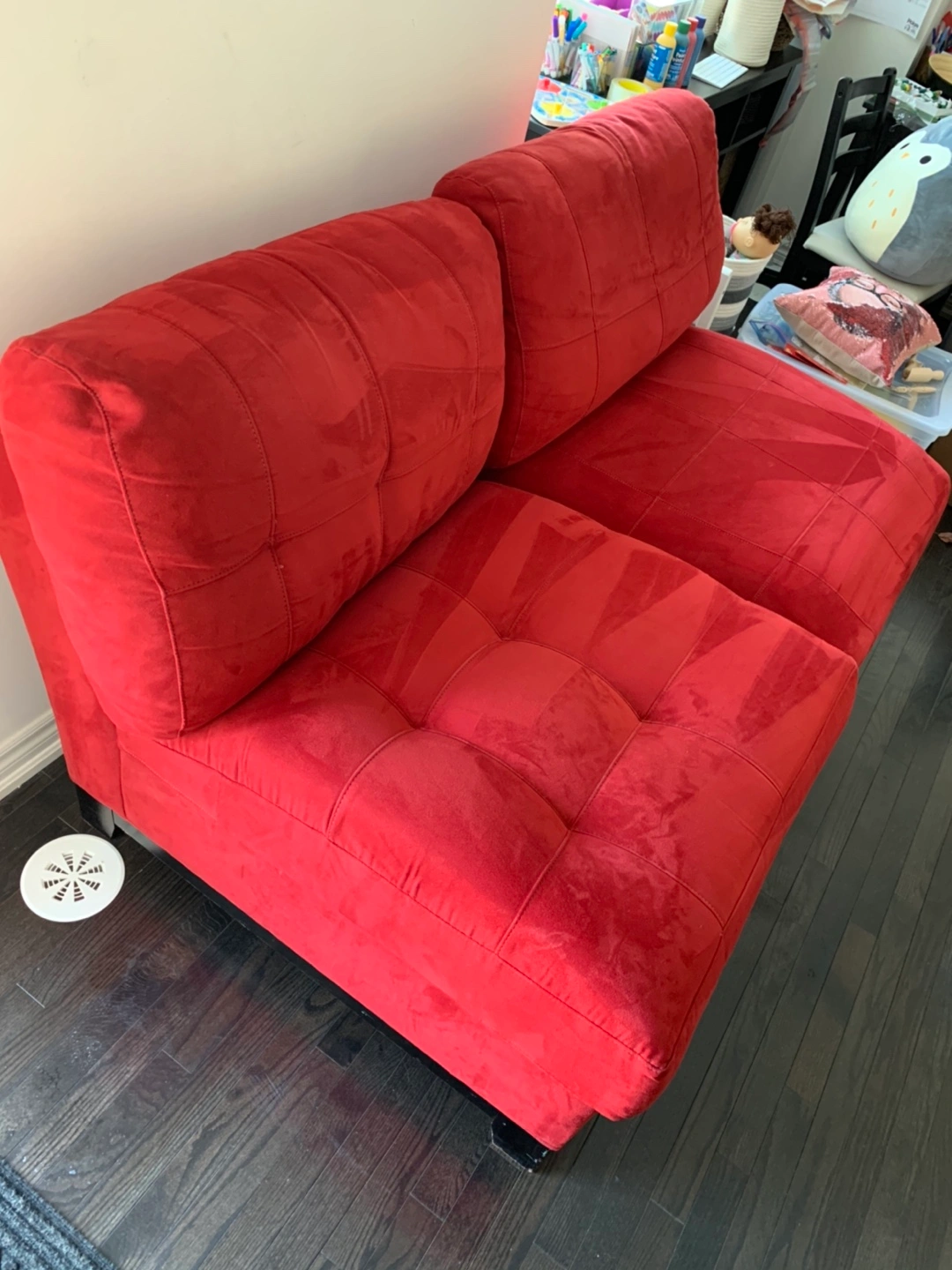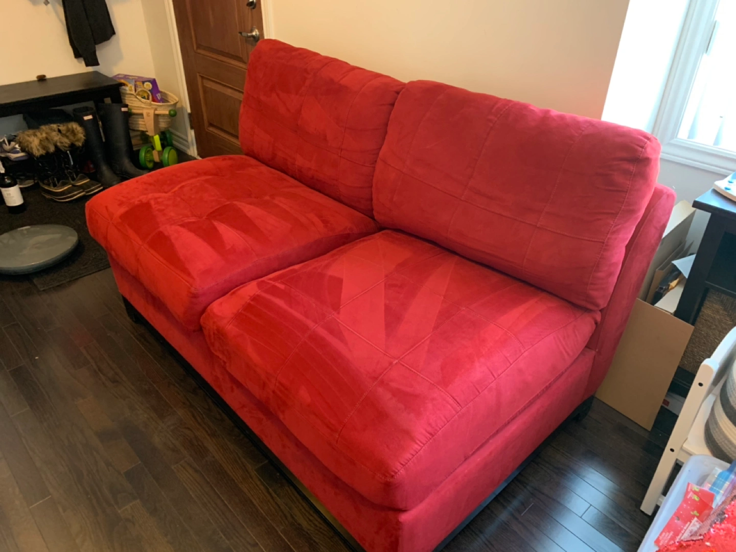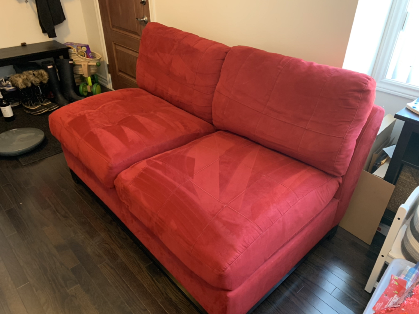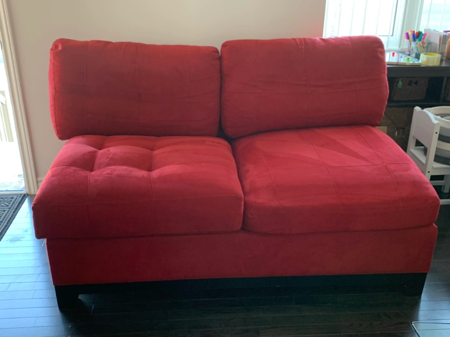 Red Microfiber Loveseat from our office. Seldom used. Wooden framing at the bottom low to the ground, armless. Two seat cushions and two back cushions are removable. One seat cushion isn't tufted.