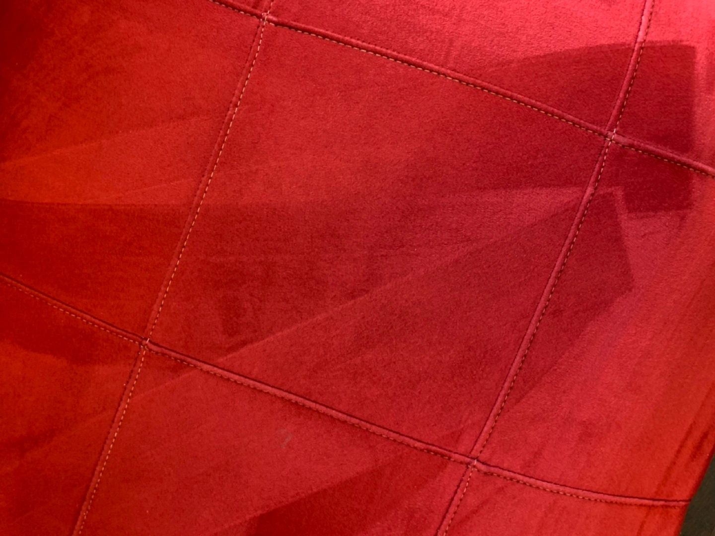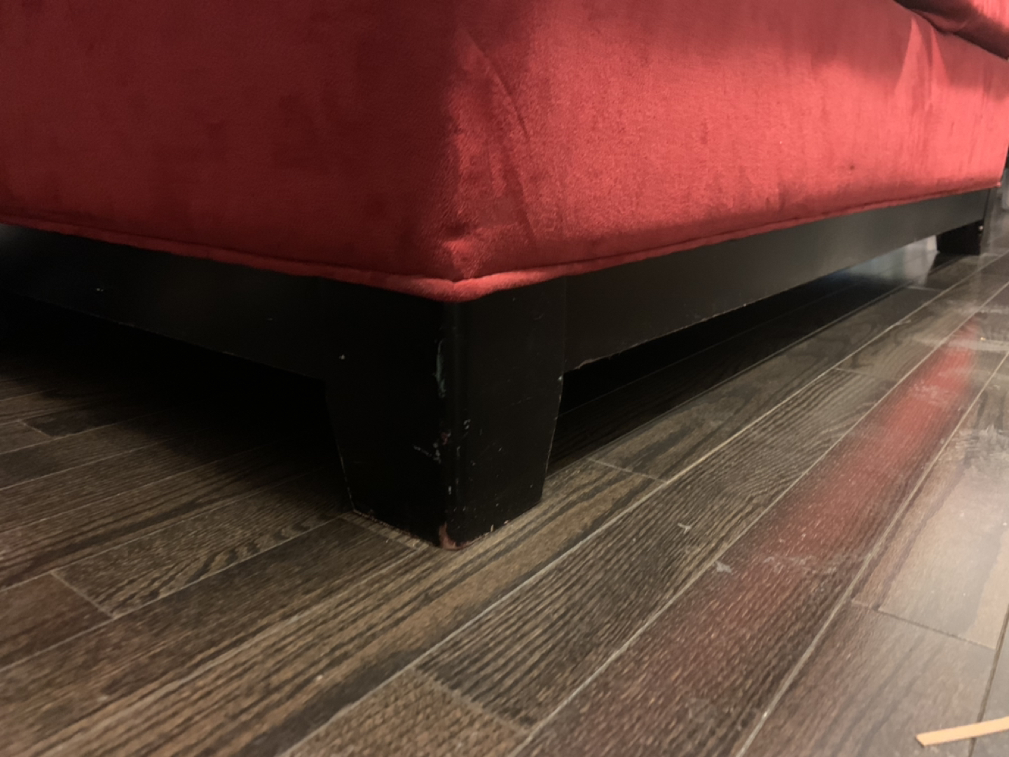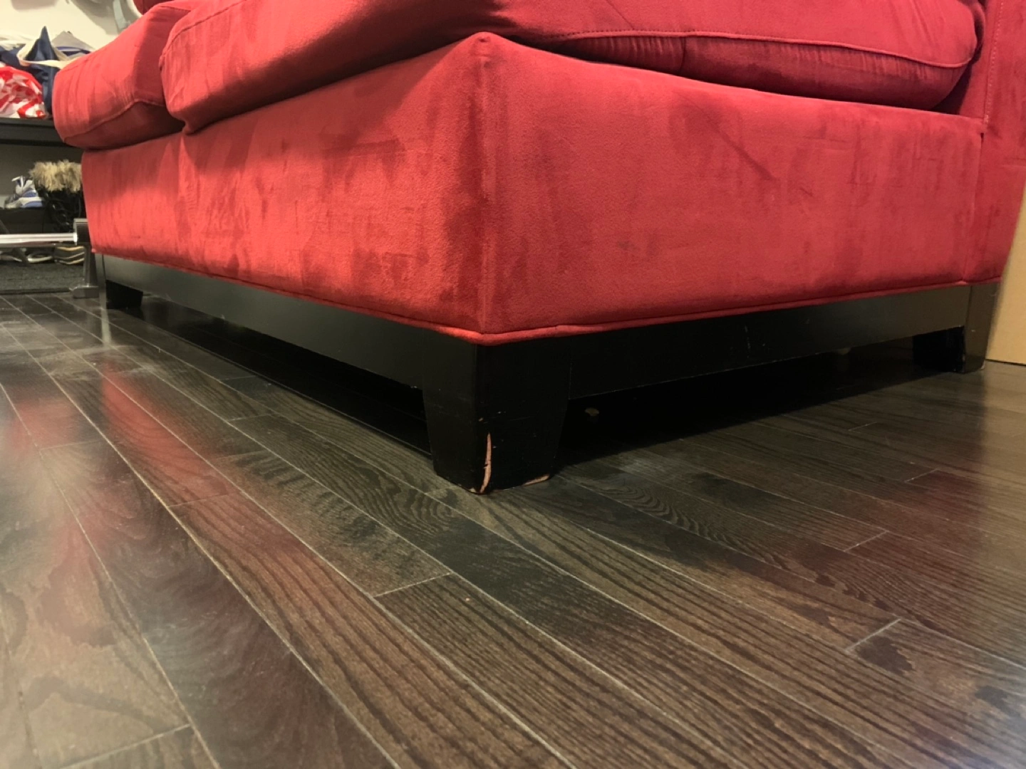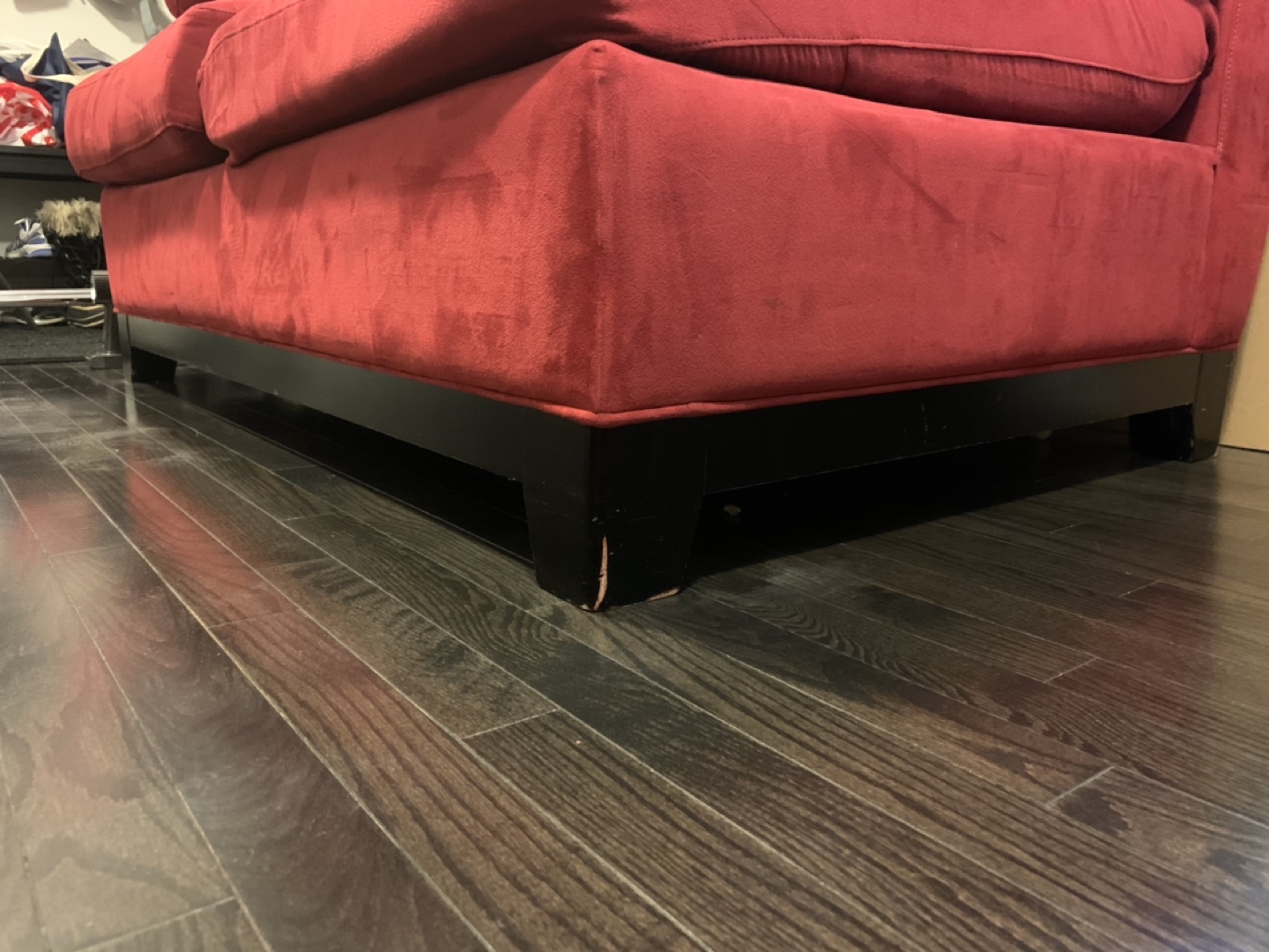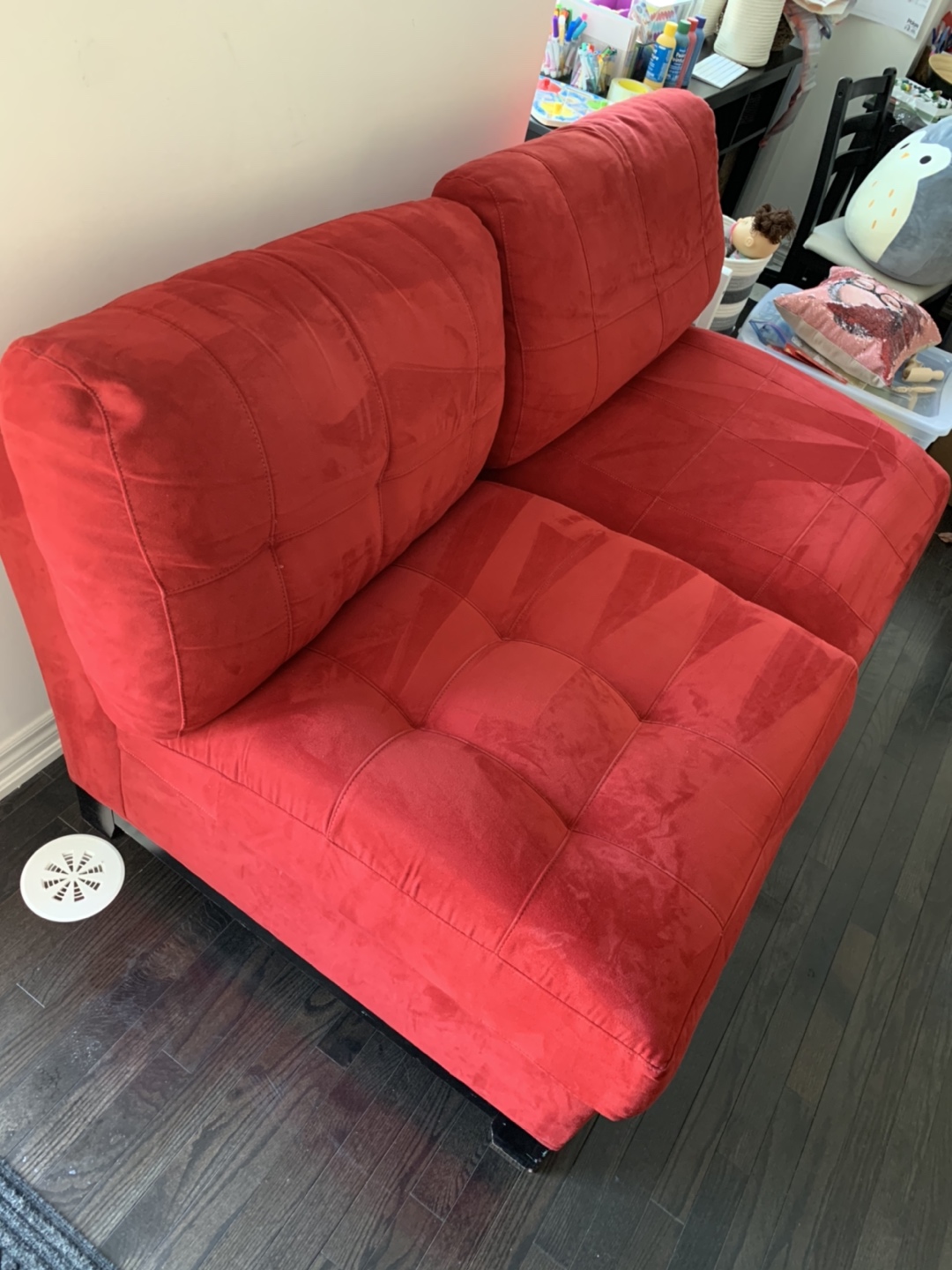 Red Microfiber Loveseat from our office. Seldom used. Wooden framing at the bottom low to the ground, armless. Two seat cushions and two back cushions are removable. One seat cushion isn't tufted.