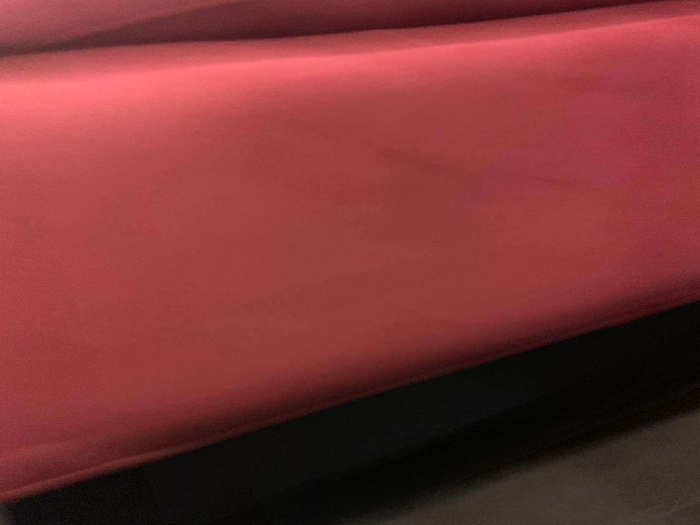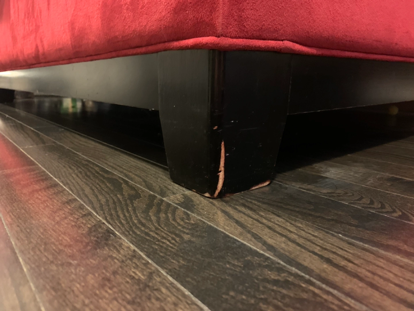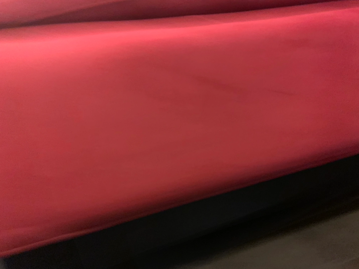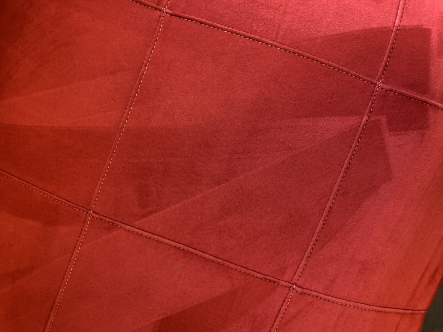 Red Microfiber Loveseat from our office. Seldom used. Wooden framing at the bottom low to the ground, armless. Two seat cushions and two back cushions are removable. One seat cushion isn't tufted.