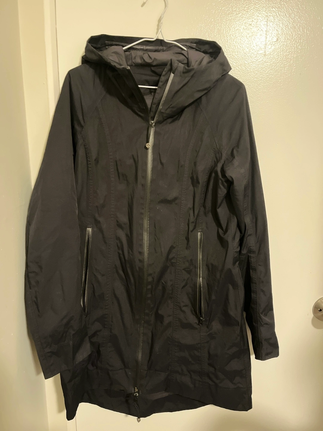152Black raincoat with a hood, long sleeves, and zipper closure. It has two zippered pockets on the front.