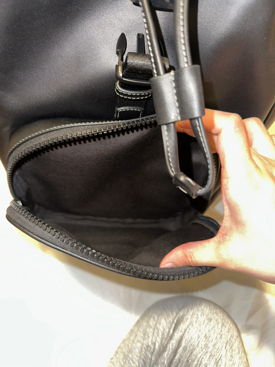 Black leather backpack. Features a top handle, drawstring closure, and multiple zippered compartments.