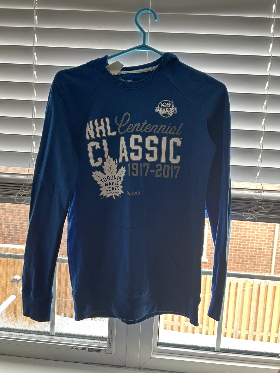 Blue hoodie with the Toronto Maple Leafs logo and NHL Centennial Classic 1917-2017 text. Long sleeves and a front pocket.