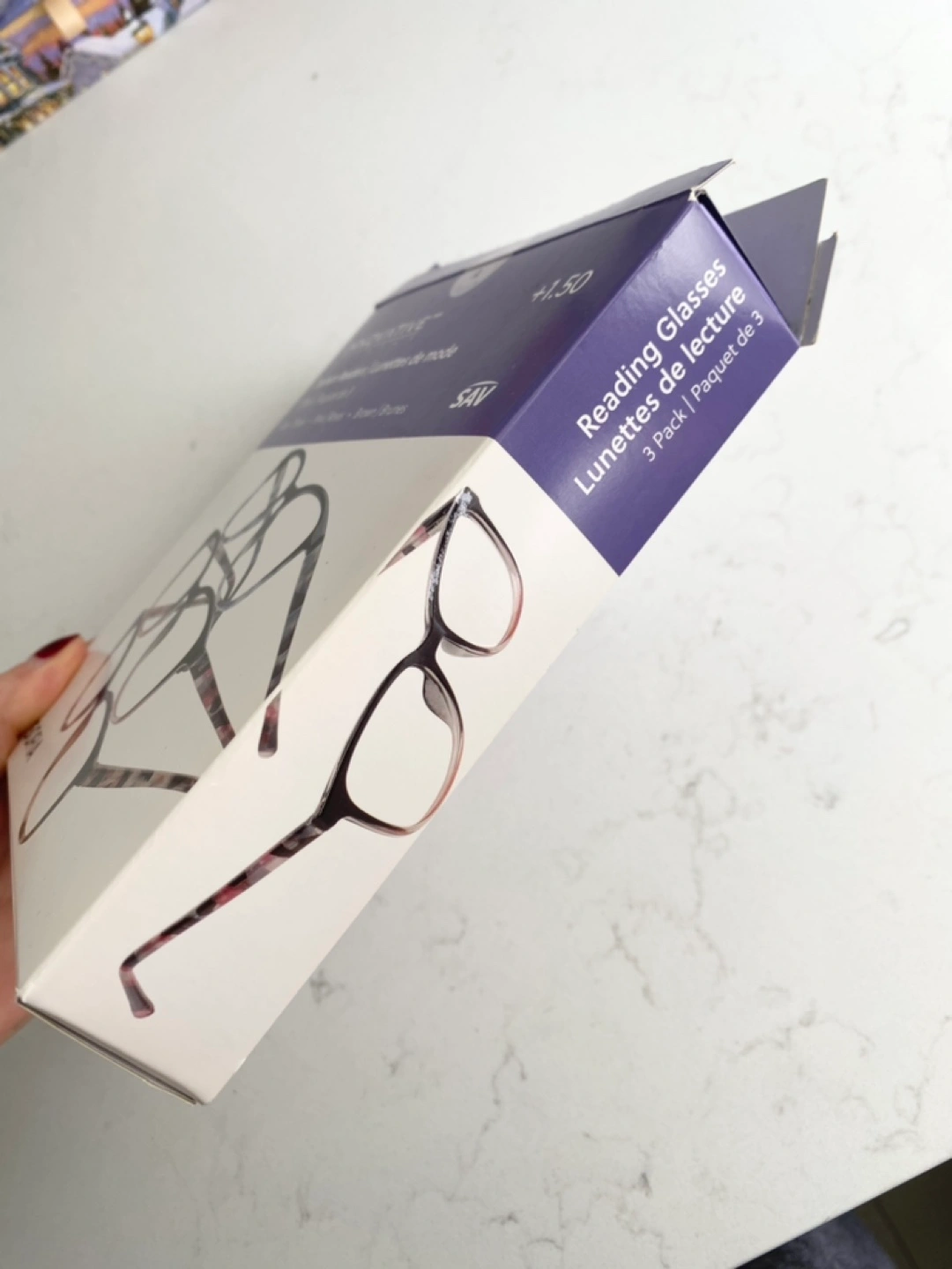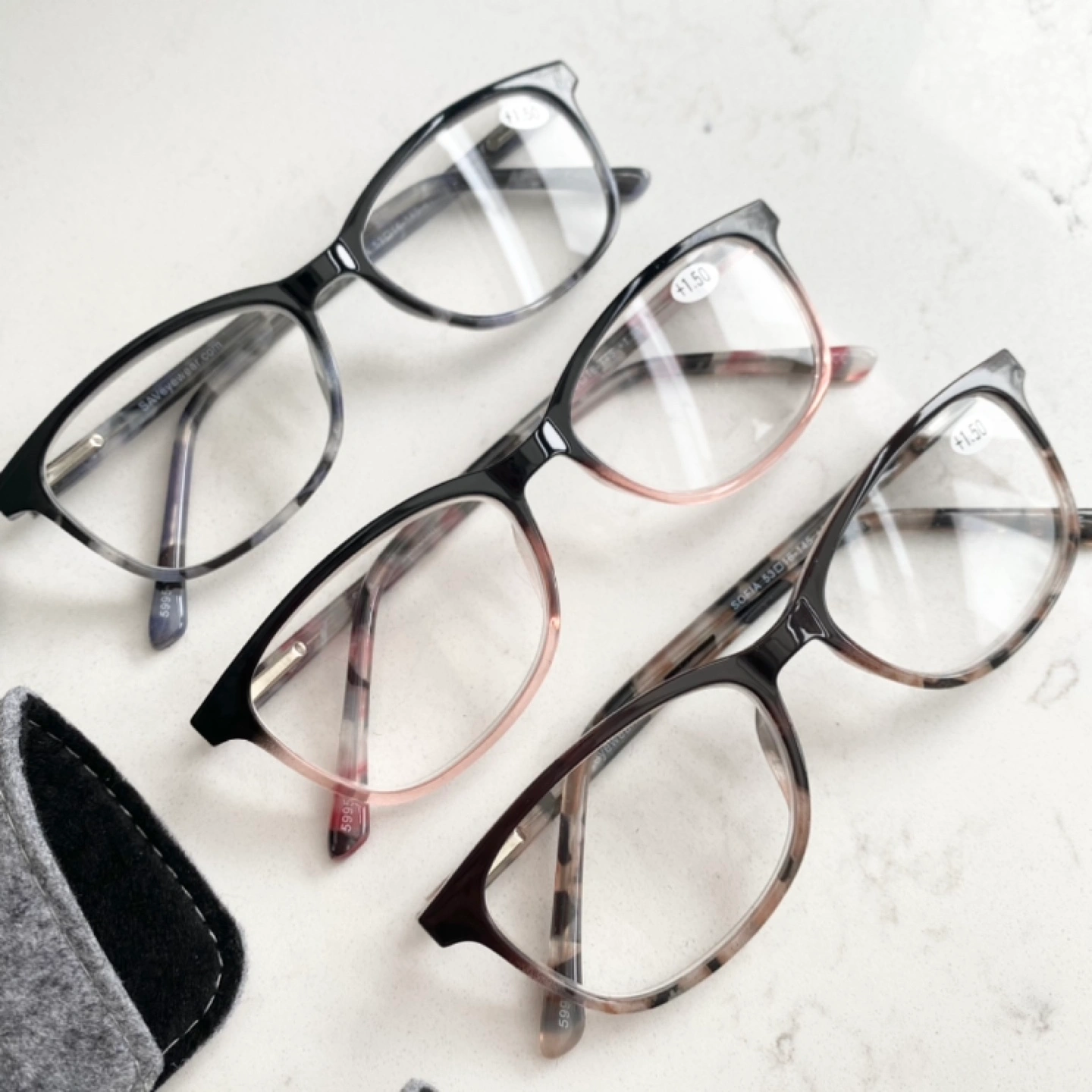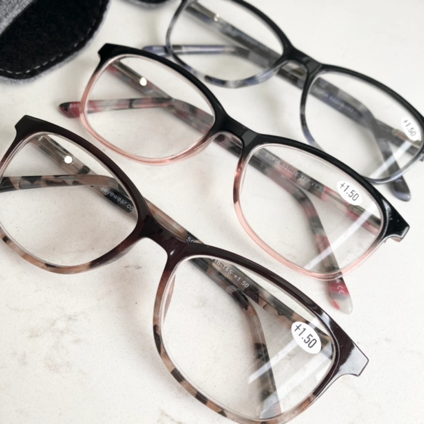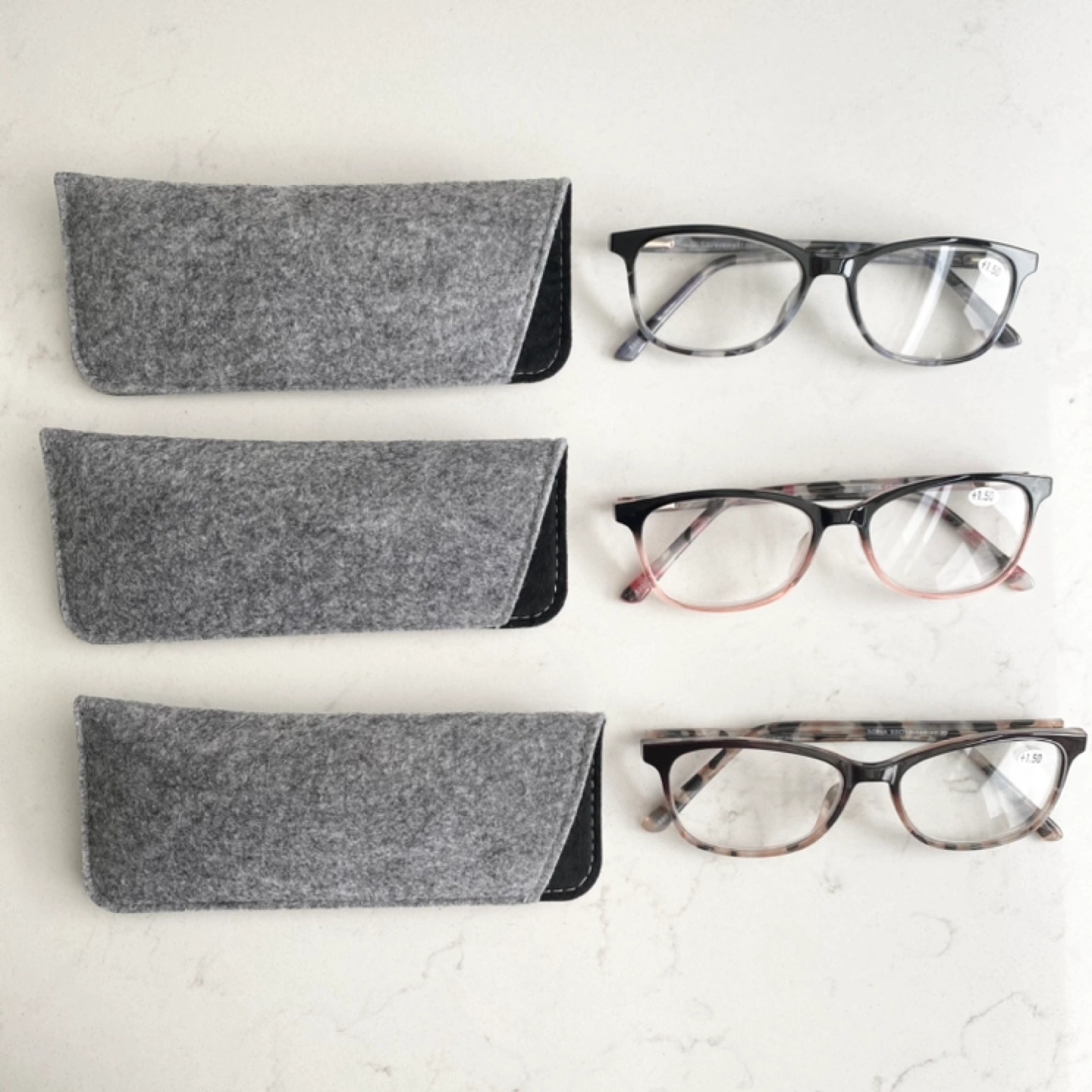 Three pairs of reading glasses in grey, pink and brown. Comes with three grey felt cases.