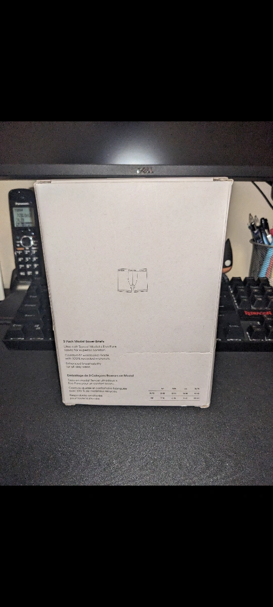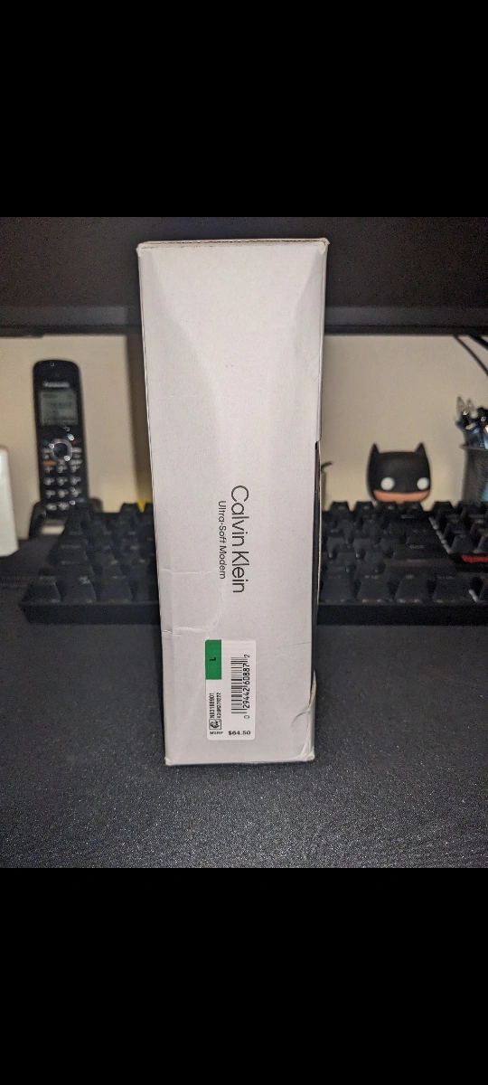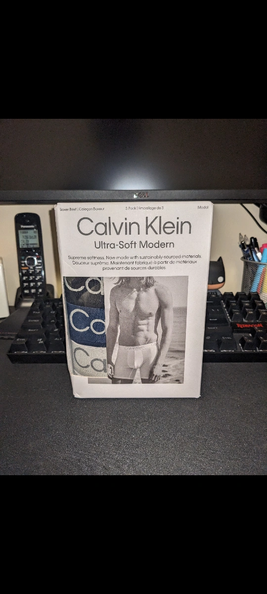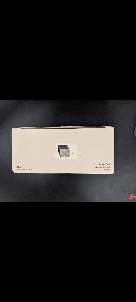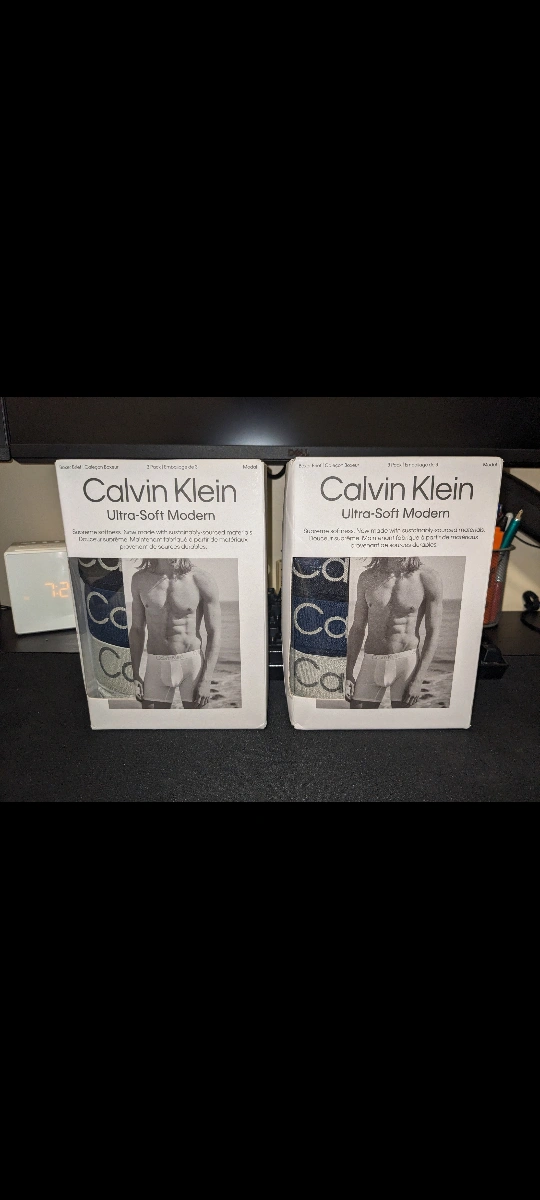 Hello, I have 2 new, three pack boxer briefs in size Large (L: 36-38 Waist) from Calvin Klein. US website during a sale in May and shipped them over to Canada. They are black, navy, and grey assorted. I accidentally bought the wrong size as they were selling out quick and they've just been sitting in my closet. I have them in my size and the modal fabric is extremely soft.