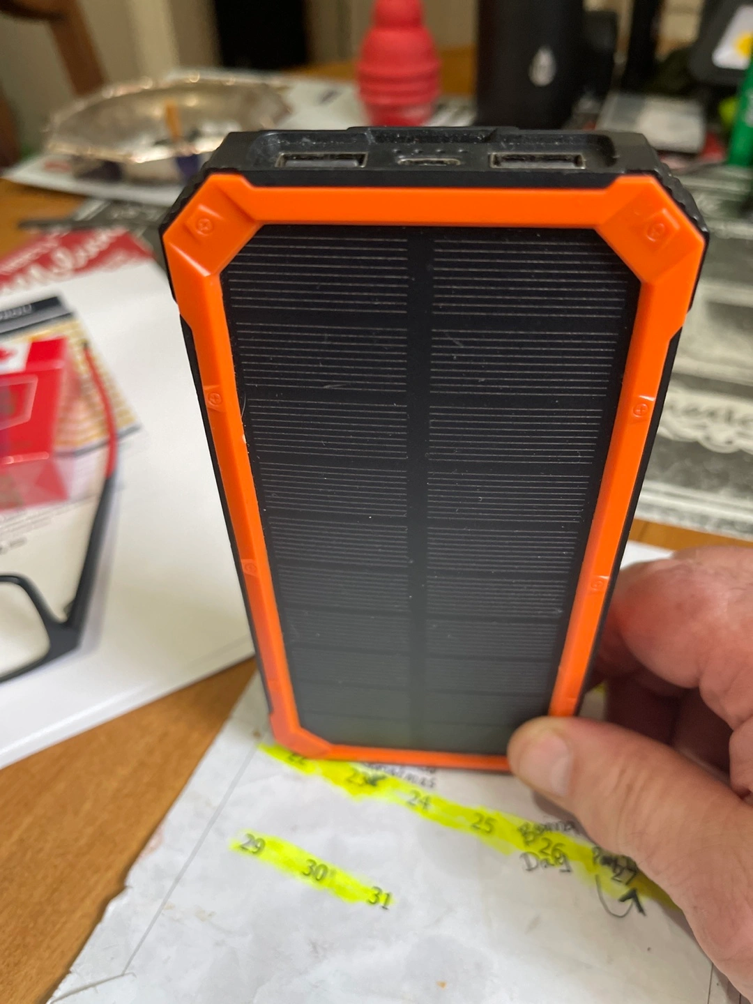 59Solar power bank with two USB outputs and a flashlight. Black with orange trim. Works flawlessly comes with charging cord if interested call or text 519-933-7860. Ask for Bill serious inquiries only accepting cash no E transfers, I will be up until sold.