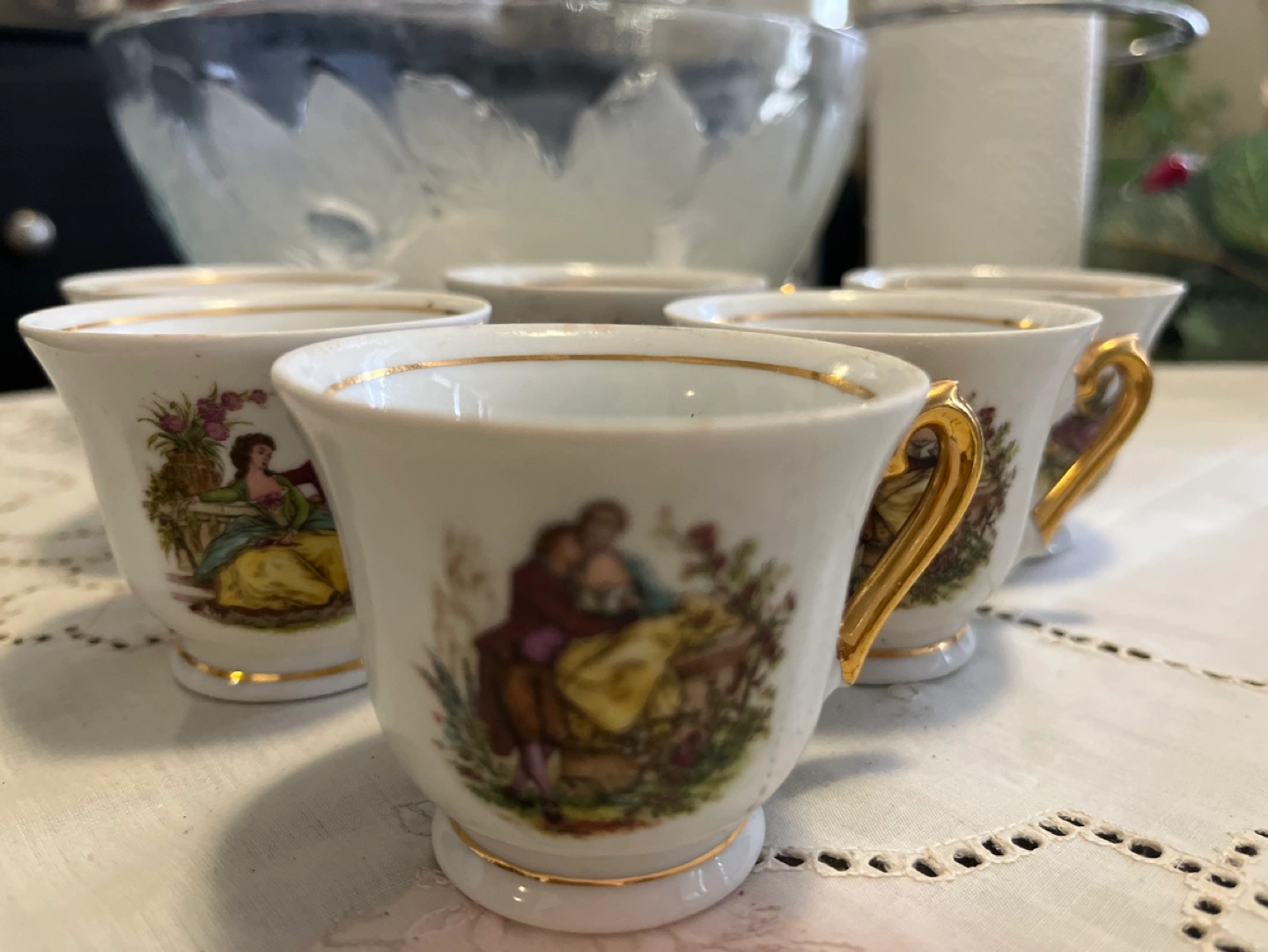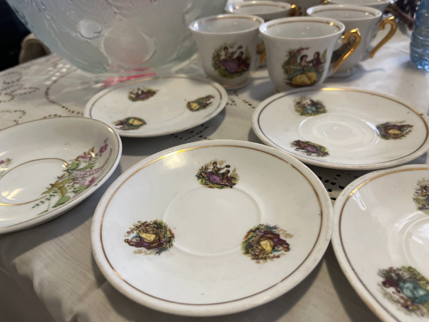 Set of six teacups and saucers. Gold trim. Each cup and saucer has a unique design featuring a couple.
