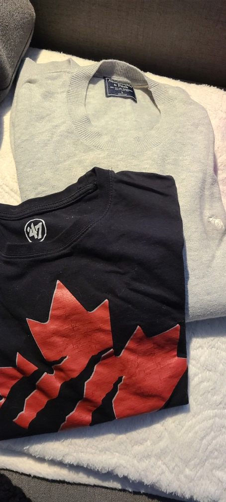 free free free 1x Black t-shirt with red maple leaf design and a 47 logo. 1x abercrombie large sweater Pick up by Gerrard and River St address given once meetup is set up