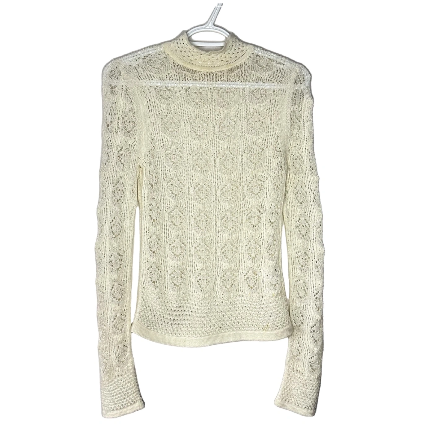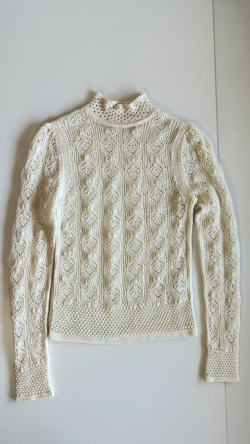 Crystal white knit sweater with long sleeves and a frilly mock neck. Intricate lace- like knit pattern.